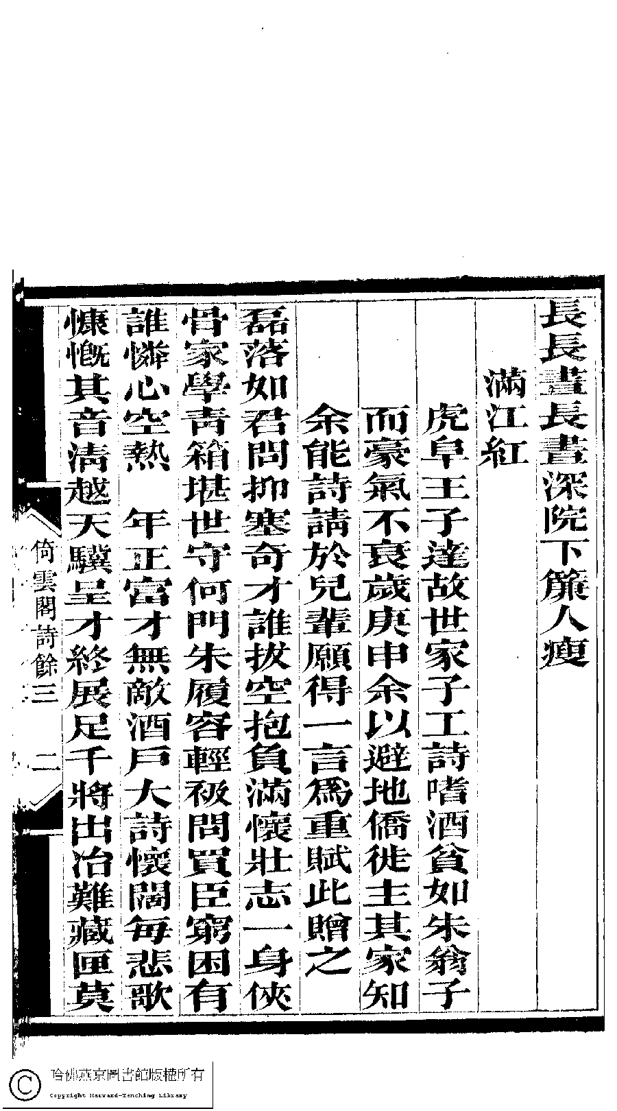 | (PRINT FRIENDLY VERSION) 倚雲閣詩存﹕三卷﹐補遺﹕一卷﹐詩餘存﹕三卷(清張友書撰)。清光緒十二年(1886)刻本。 ![]() Page : 詩餘.3.2a | click for larger image | 倚雲閣詩存﹕三卷﹐補遺﹕一卷﹐詩餘存﹕三卷(清張友書撰)。清光緒十二年(1886)刻本。![]() Page : 詩餘.3.1b | click for larger image | Back |