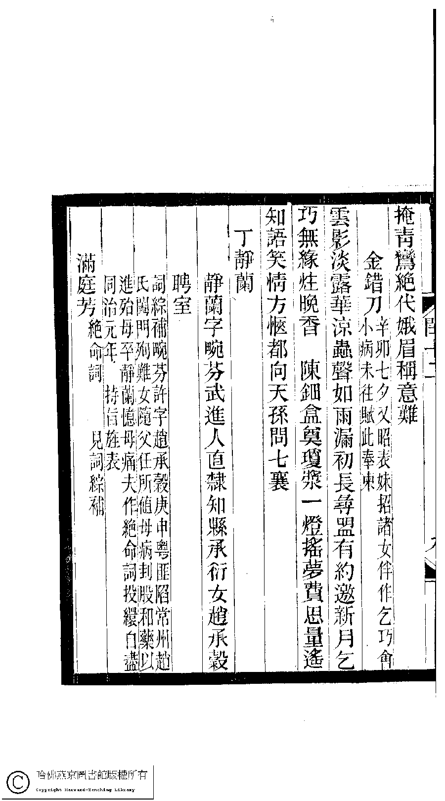 | (PRINT FRIENDLY VERSION) 閨秀詞鈔﹕十六卷(清徐乃昌輯)。清宣統元年(1909)小檀欒室刻本。 ![]() Page : 12.9b | click for larger image | Back |