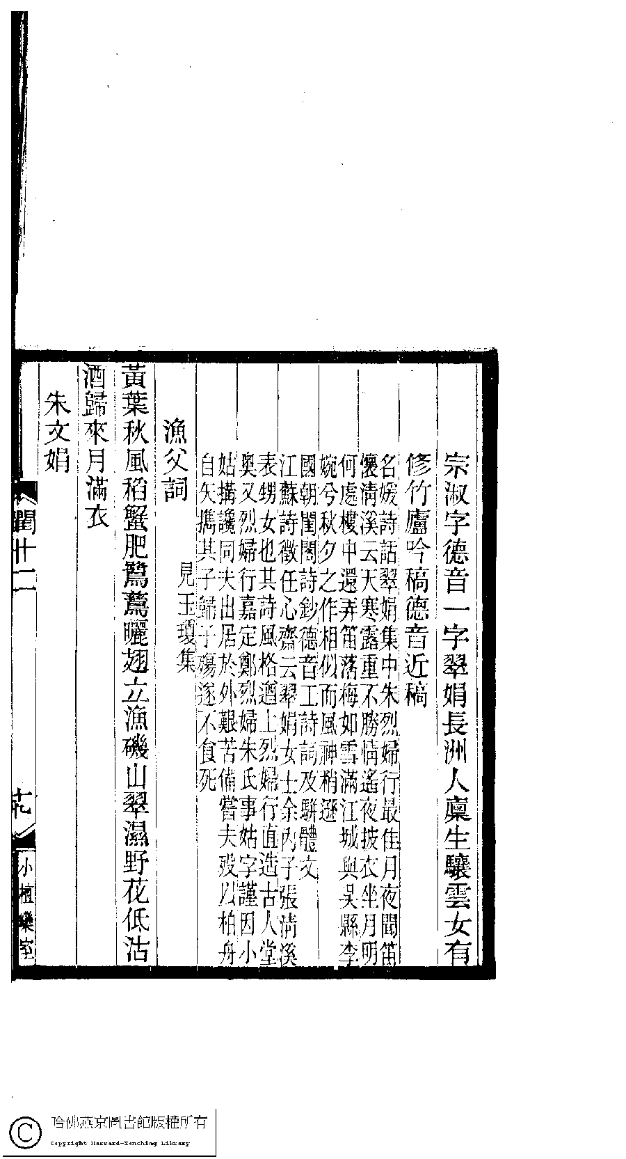| (PRINT FRIENDLY VERSION) 閨秀詞鈔﹕十六卷(清徐乃昌輯)。清宣統元年(1909)小檀欒室刻本。 ![]() Page : 12.19b | click for larger image | 閨秀詞鈔﹕十六卷(清徐乃昌輯)。清宣統元年(1909)小檀欒室刻本。![]() Page : 12.19a | click for larger image | Back |