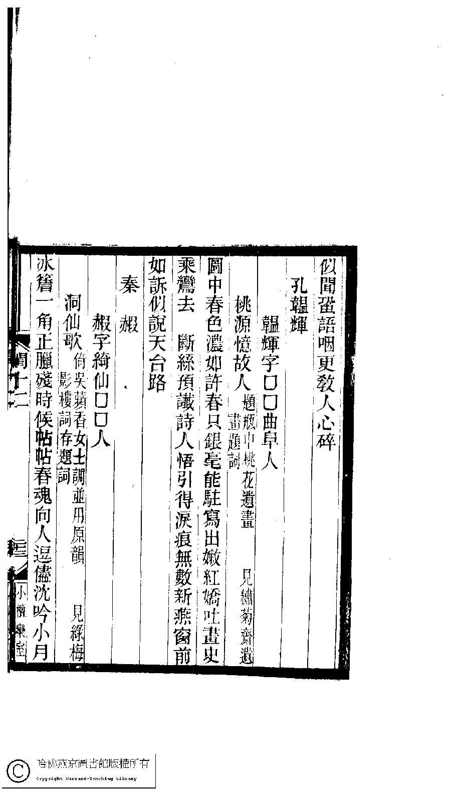 | (PRINT FRIENDLY VERSION) 閨秀詞鈔﹕十六卷(清徐乃昌輯)。清宣統元年(1909)小檀欒室刻本。 ![]() Page : 12.23a | click for larger image | Back |