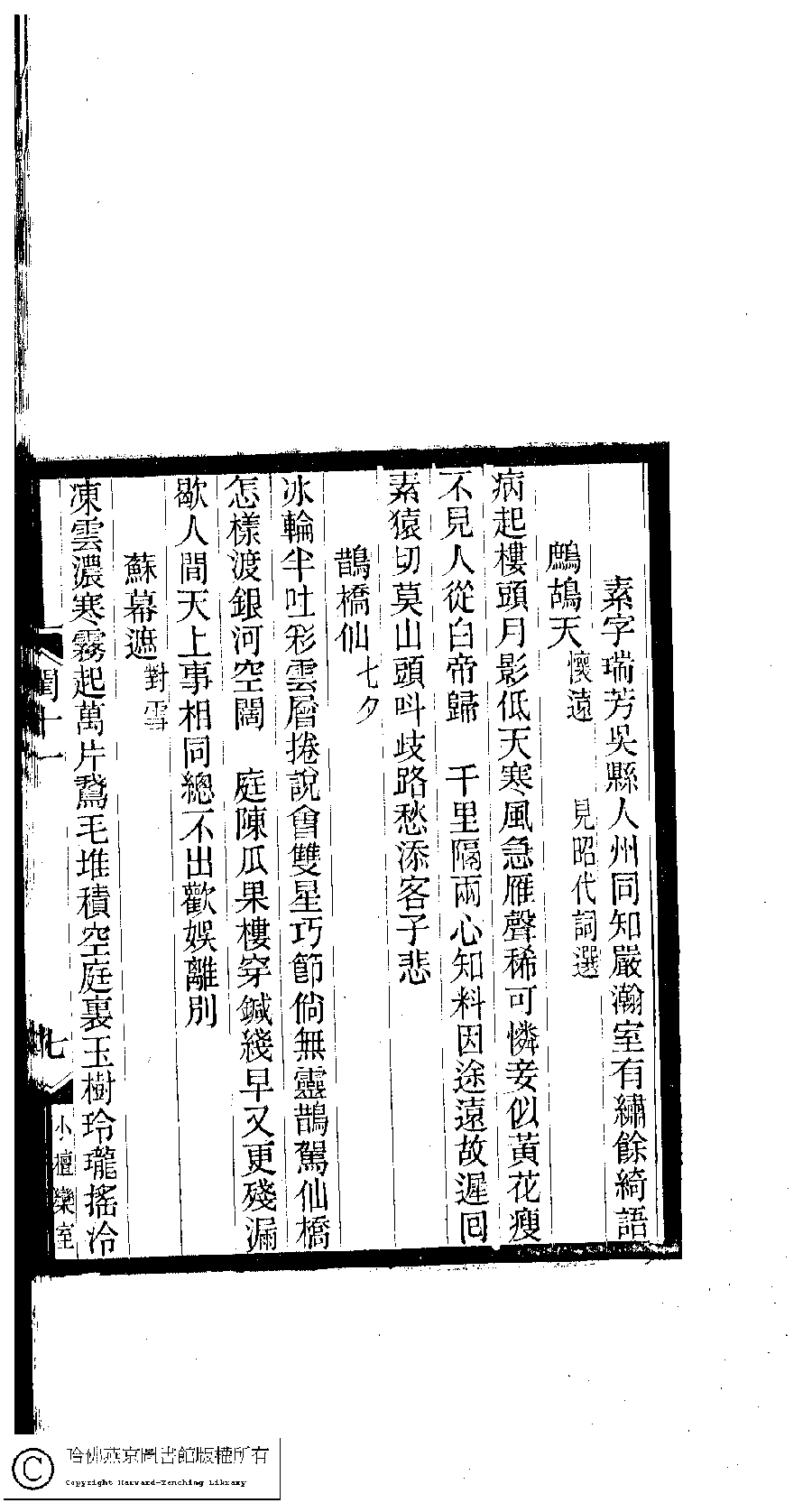 | (PRINT FRIENDLY VERSION) 閨秀詞鈔﹕十六卷(清徐乃昌輯)。清宣統元年(1909)小檀欒室刻本。 ![]() Page : 11.7a | click for larger image | 閨秀詞鈔﹕十六卷(清徐乃昌輯)。清宣統元年(1909)小檀欒室刻本。![]() Page : 11.6b | click for larger image | Back |