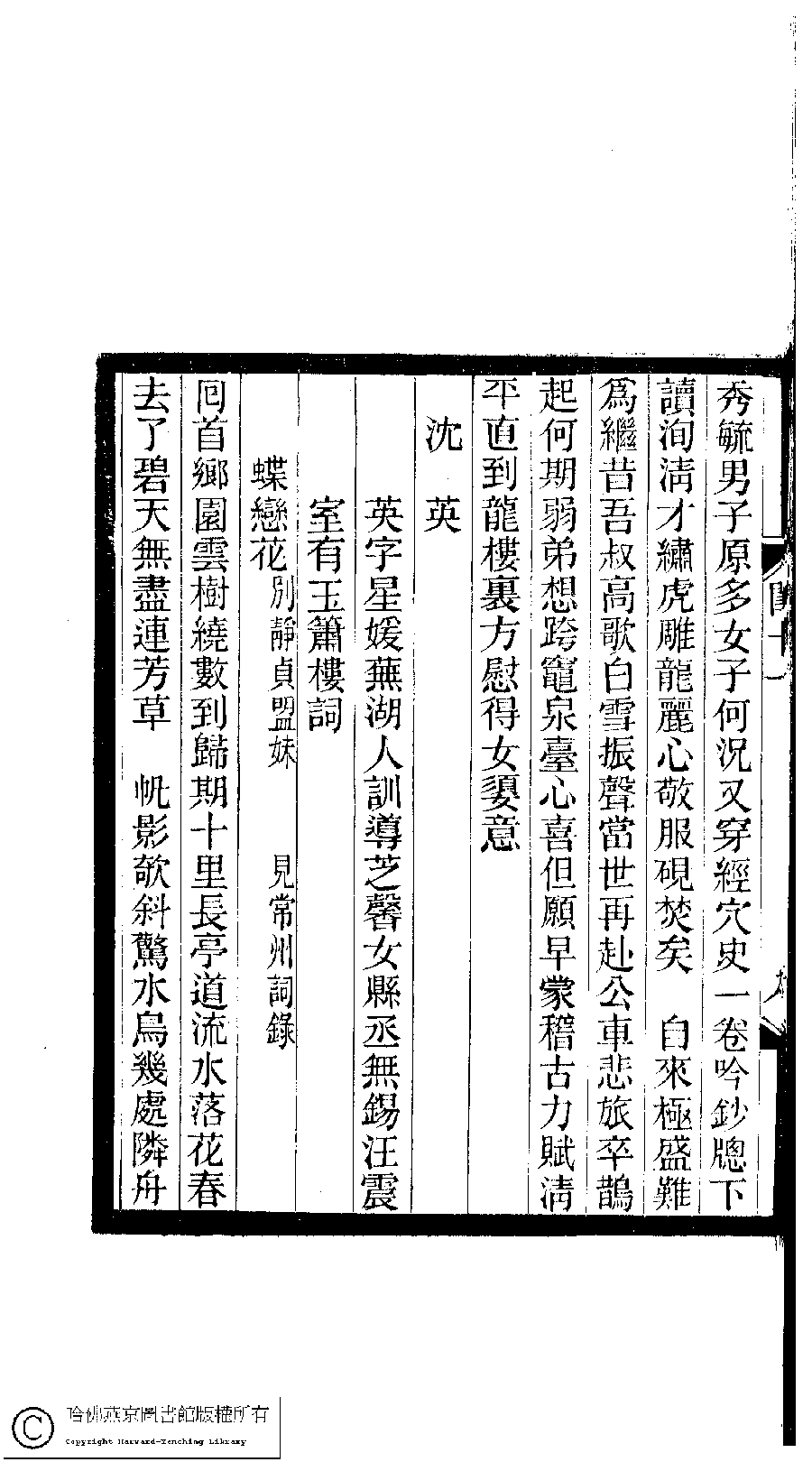 | (PRINT FRIENDLY VERSION) 閨秀詞鈔﹕十六卷(清徐乃昌輯)。清宣統元年(1909)小檀欒室刻本。 ![]() Page : 11.8b | click for larger image | Back |