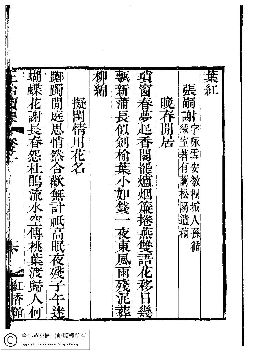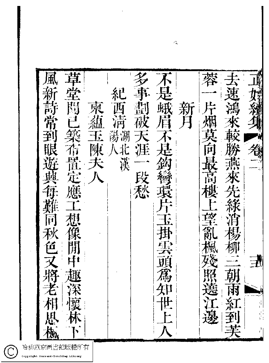 | (PRINT FRIENDLY VERSION) 國朝閨秀正始續集﹕十卷﹐附錄﹕一卷﹐補遺﹕一卷﹐輓詞﹕一卷(清惲珠輯)。清道光十六年(1836)紅香館刻本。 ![]() Page : 2.16a | click for larger image | 國朝閨秀正始續集﹕十卷﹐附錄﹕一卷﹐補遺﹕一卷﹐輓詞﹕一卷(清惲珠輯)。清道光十六年(1836)紅香館刻本。![]() Page : 2.15b | click for larger image | Back |