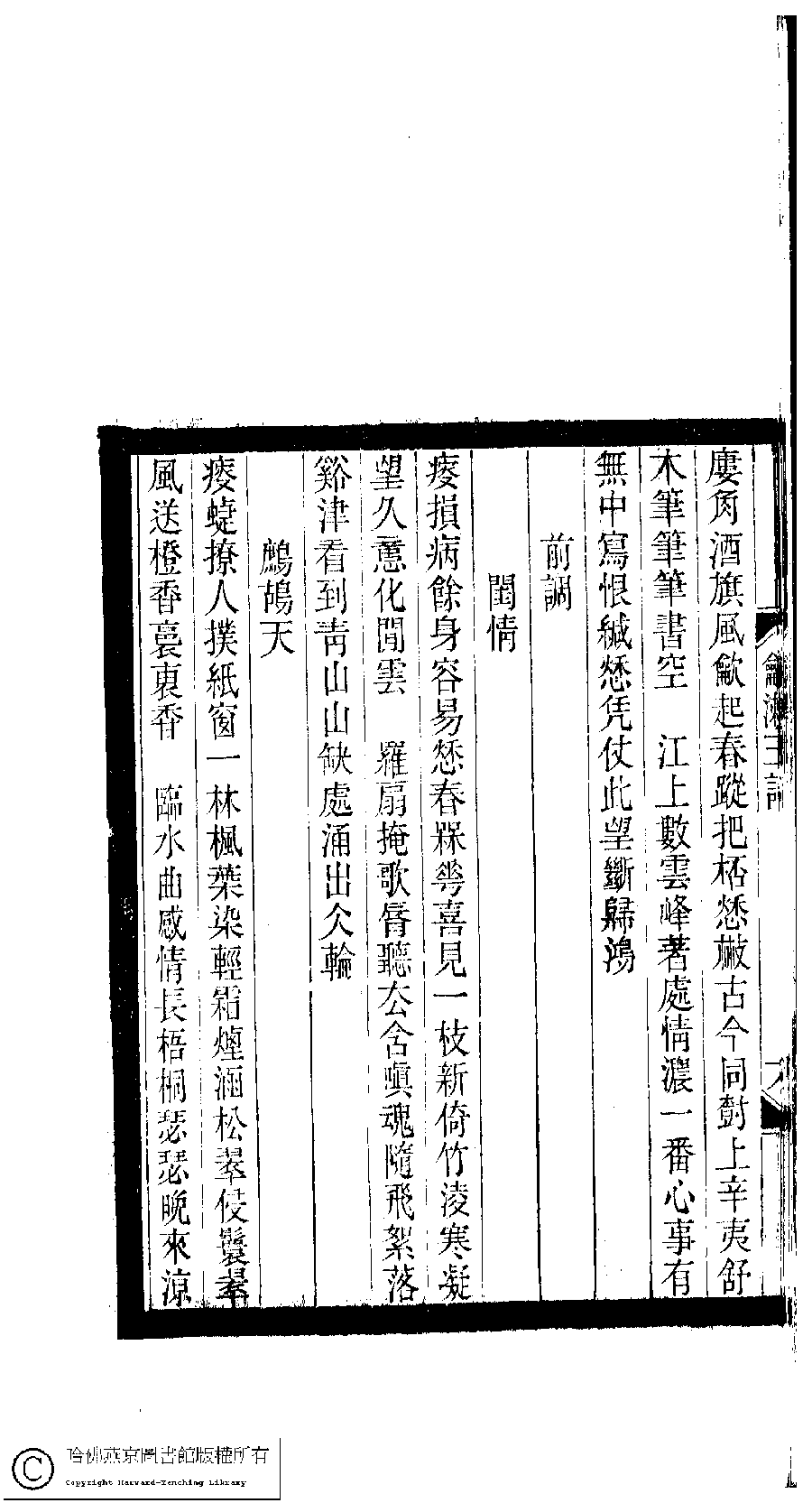 | (PRINT FRIENDLY VERSION) 小檀欒室彙刻閨秀詞﹕十集一百種一百卷(清徐乃昌輯) : 和漱玉詞﹕一卷。清光緒二十二年(1896)南陵徐氏刻本。 ![]() Page : 和漱玉詞.7a | click for larger image | 小檀欒室彙刻閨秀詞﹕十集一百種一百卷(清徐乃昌輯) : 和漱玉詞﹕一卷。清光緒二十二年(1896)南陵徐氏刻本。![]() Page : 和漱玉詞.6b | click for larger image | Back |