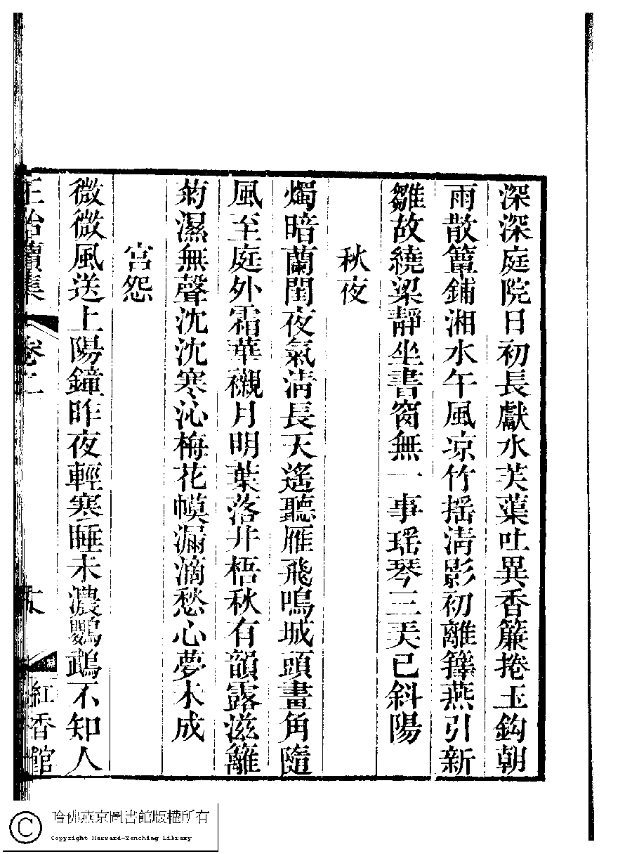 | (PRINT FRIENDLY VERSION) 國朝閨秀正始續集﹕十卷﹐附錄﹕一卷﹐補遺﹕一卷﹐輓詞﹕一卷(清惲珠輯)。清道光十六年(1836)紅香館刻本。 ![]() Page : 2.18a | click for larger image | 國朝閨秀正始續集﹕十卷﹐附錄﹕一卷﹐補遺﹕一卷﹐輓詞﹕一卷(清惲珠輯)。清道光十六年(1836)紅香館刻本。![]() Page : 2.17b | click for larger image | Back |