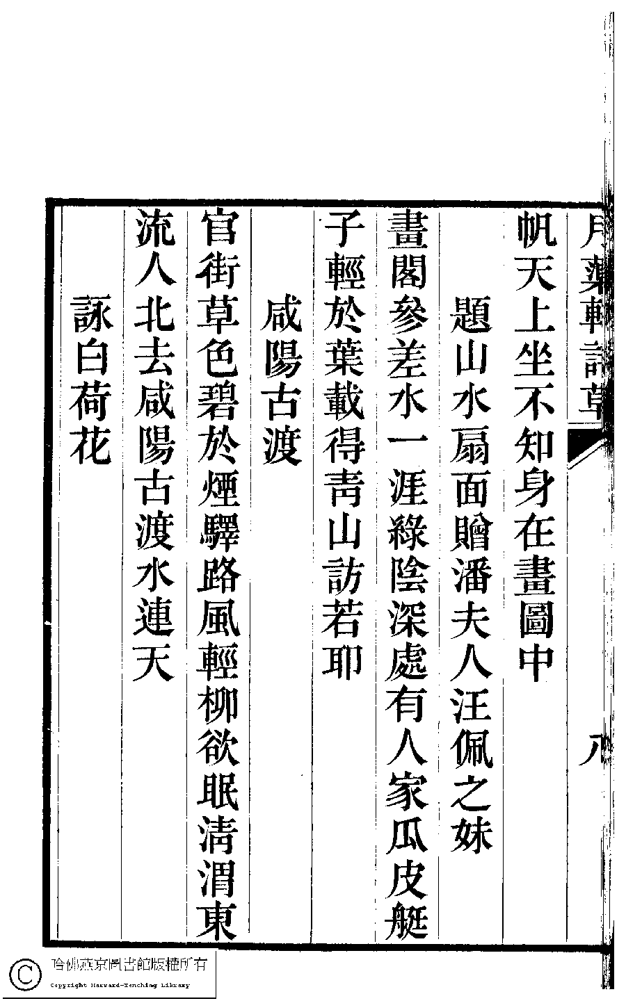 | (PRINT FRIENDLY VERSION) 月蕖軒詩草﹕一卷﹐詩餘﹕一卷(清袁鏡蓉撰)。清道光二十八年(1848)刻本。 ![]() Page : 1.8b | click for larger image | 月蕖軒詩草﹕一卷﹐詩餘﹕一卷(清袁鏡蓉撰)。清道光二十八年(1848)刻本。![]() Page : 1.8a | click for larger image | Back |
