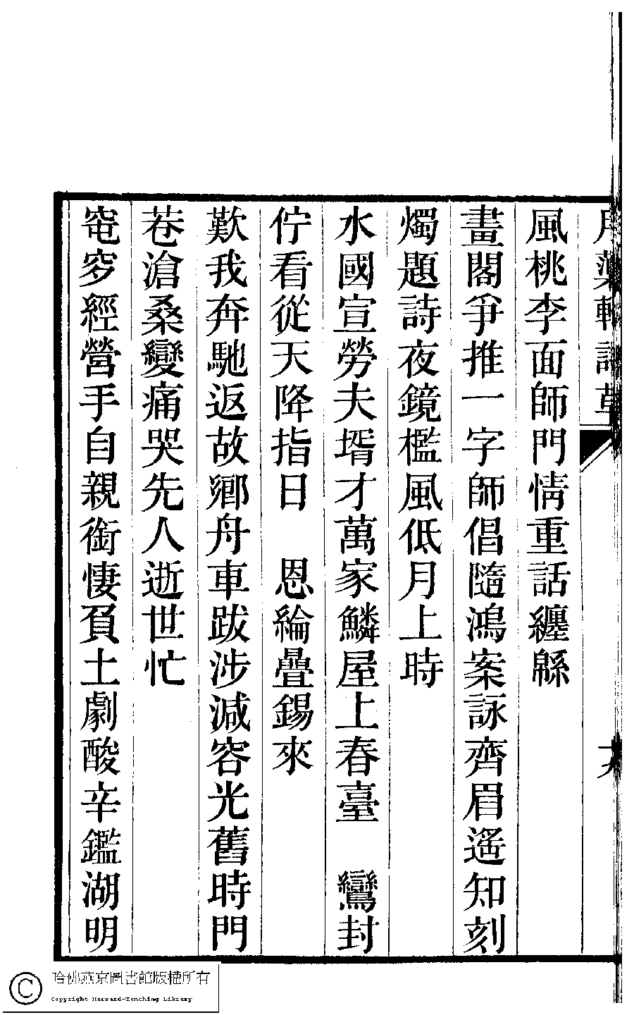| (PRINT FRIENDLY VERSION) 月蕖軒詩草﹕一卷﹐詩餘﹕一卷(清袁鏡蓉撰)。清道光二十八年(1848)刻本。 ![]() Page : 1.20a | click for larger image | 月蕖軒詩草﹕一卷﹐詩餘﹕一卷(清袁鏡蓉撰)。清道光二十八年(1848)刻本。![]() Page : 1.19b | click for larger image | 月蕖軒詩草﹕一卷﹐詩餘﹕一卷(清袁鏡蓉撰)。清道光二十八年(1848)刻本。![]() Page : 1.19a | click for larger image | Back |