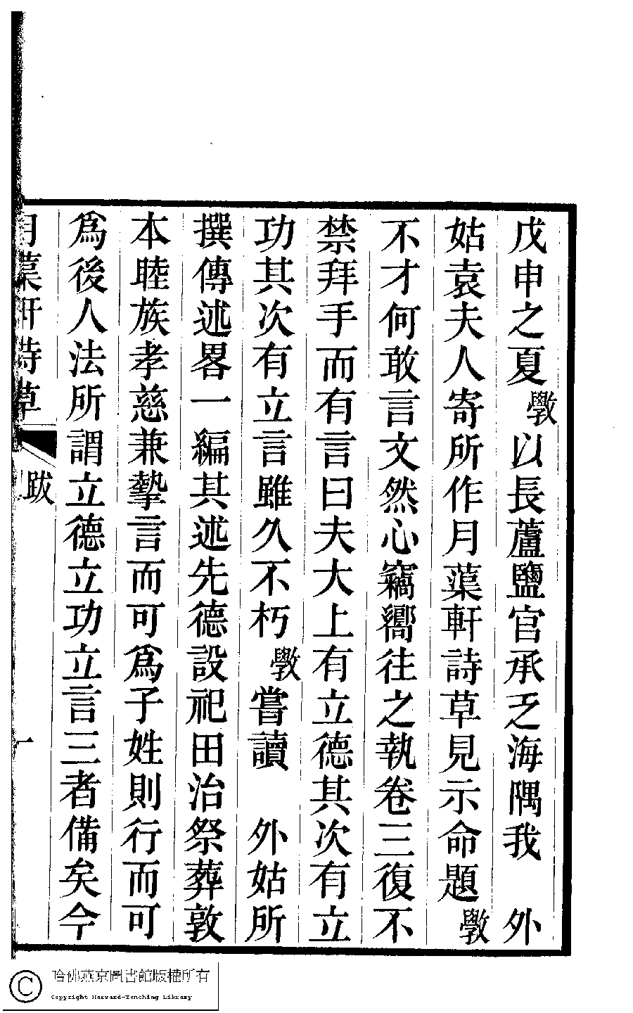 | (PRINT FRIENDLY VERSION) 月蕖軒詩草﹕一卷﹐詩餘﹕一卷(清袁鏡蓉撰)。清道光二十八年(1848)刻本。 ![]() Page : 跋.1b | click for larger image | 月蕖軒詩草﹕一卷﹐詩餘﹕一卷(清袁鏡蓉撰)。清道光二十八年(1848)刻本。![]() Page : 跋.1a | click for larger image | Back |