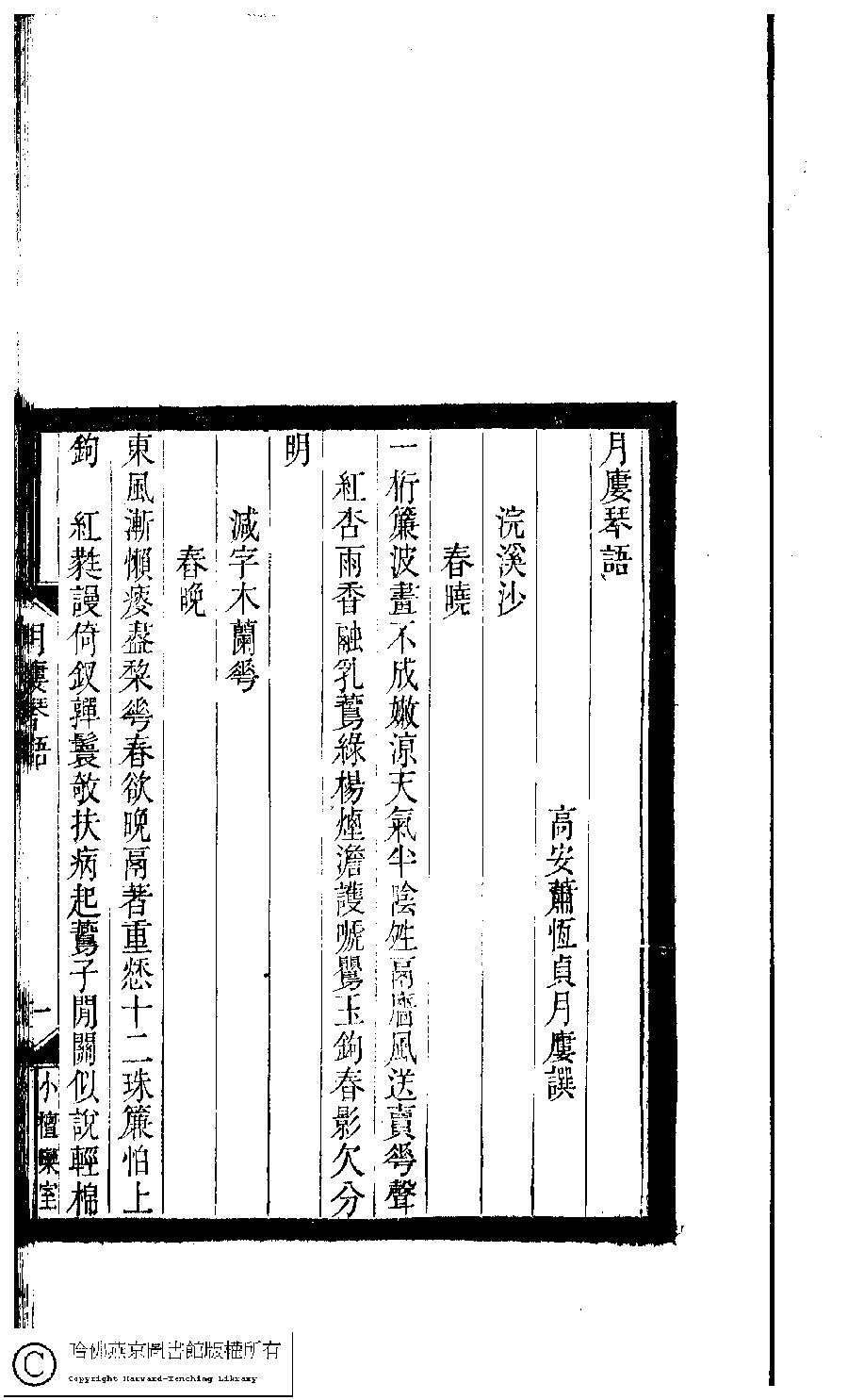 | (PRINT FRIENDLY VERSION) 小檀欒室彙刻閨秀詞﹕十集一百種一百卷(清徐乃昌輯) : 月樓琴語﹕一卷。清光緒二十二年(1896)南陵徐氏刻本。 ![]() Page : 月樓琴語.1a | click for larger image | Back |