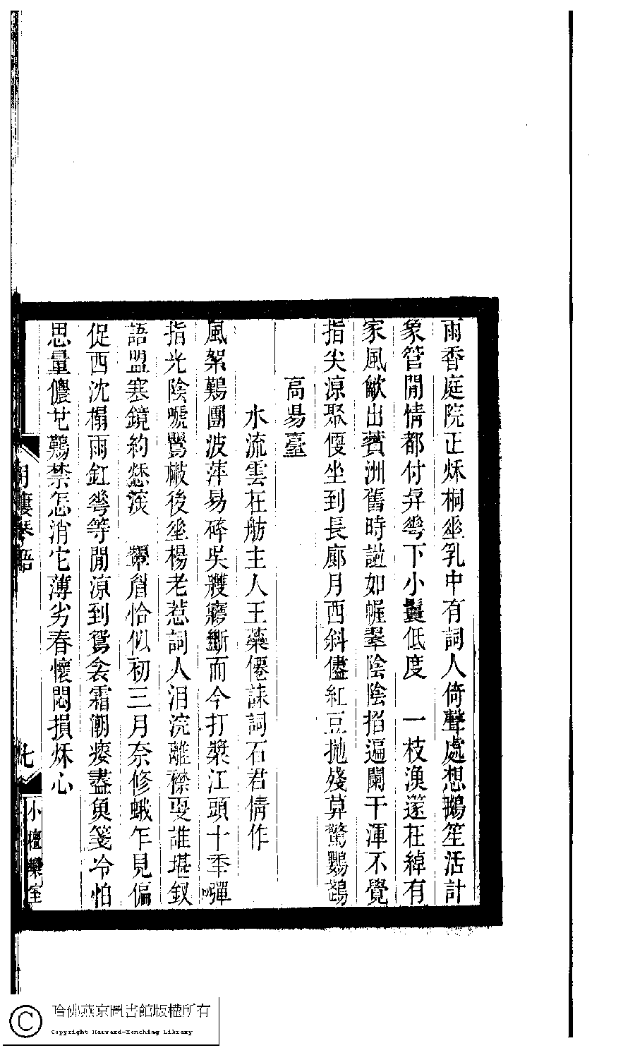 | (PRINT FRIENDLY VERSION) 小檀欒室彙刻閨秀詞﹕十集一百種一百卷(清徐乃昌輯) : 月樓琴語﹕一卷。清光緒二十二年(1896)南陵徐氏刻本。 ![]() Page : 月樓琴語.7a | click for larger image | 小檀欒室彙刻閨秀詞﹕十集一百種一百卷(清徐乃昌輯) : 月樓琴語﹕一卷。清光緒二十二年(1896)南陵徐氏刻本。![]() Page : 月樓琴語.6b | click for larger image | Back |