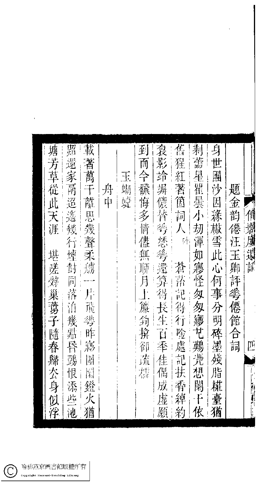 | (PRINT FRIENDLY VERSION) 小檀欒室彙刻閨秀詞﹕十集一百種一百卷(清徐乃昌輯) : 倩影樓遺詞﹕一卷。清光緒二十二年(1896)南陵徐氏刻本。 ![]() Page : 倩影樓遺詞.4b | click for larger image | 小檀欒室彙刻閨秀詞﹕十集一百種一百卷(清徐乃昌輯) : 倩影樓遺詞﹕一卷。清光緒二十二年(1896)南陵徐氏刻本。![]() Page : 倩影樓遺詞.4a | click for larger image | Back |