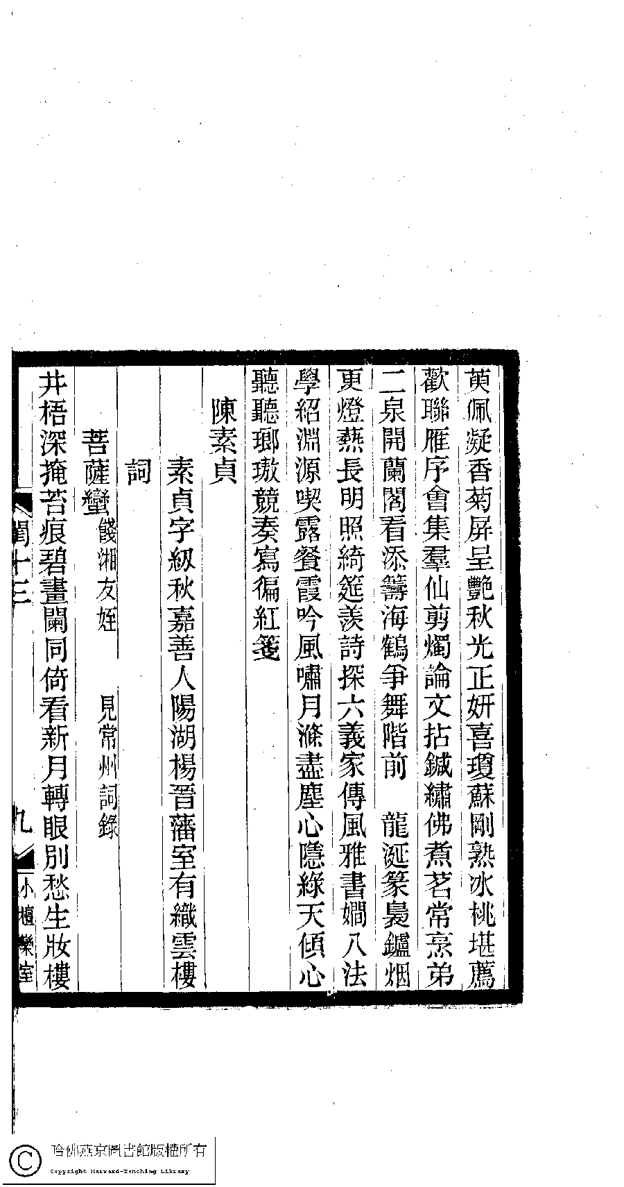 | (PRINT FRIENDLY VERSION) 閨秀詞鈔﹕十六卷(清徐乃昌輯)。清宣統元年(1909)小檀欒室刻本。 ![]() Page : 13.9a | click for larger image | Back |