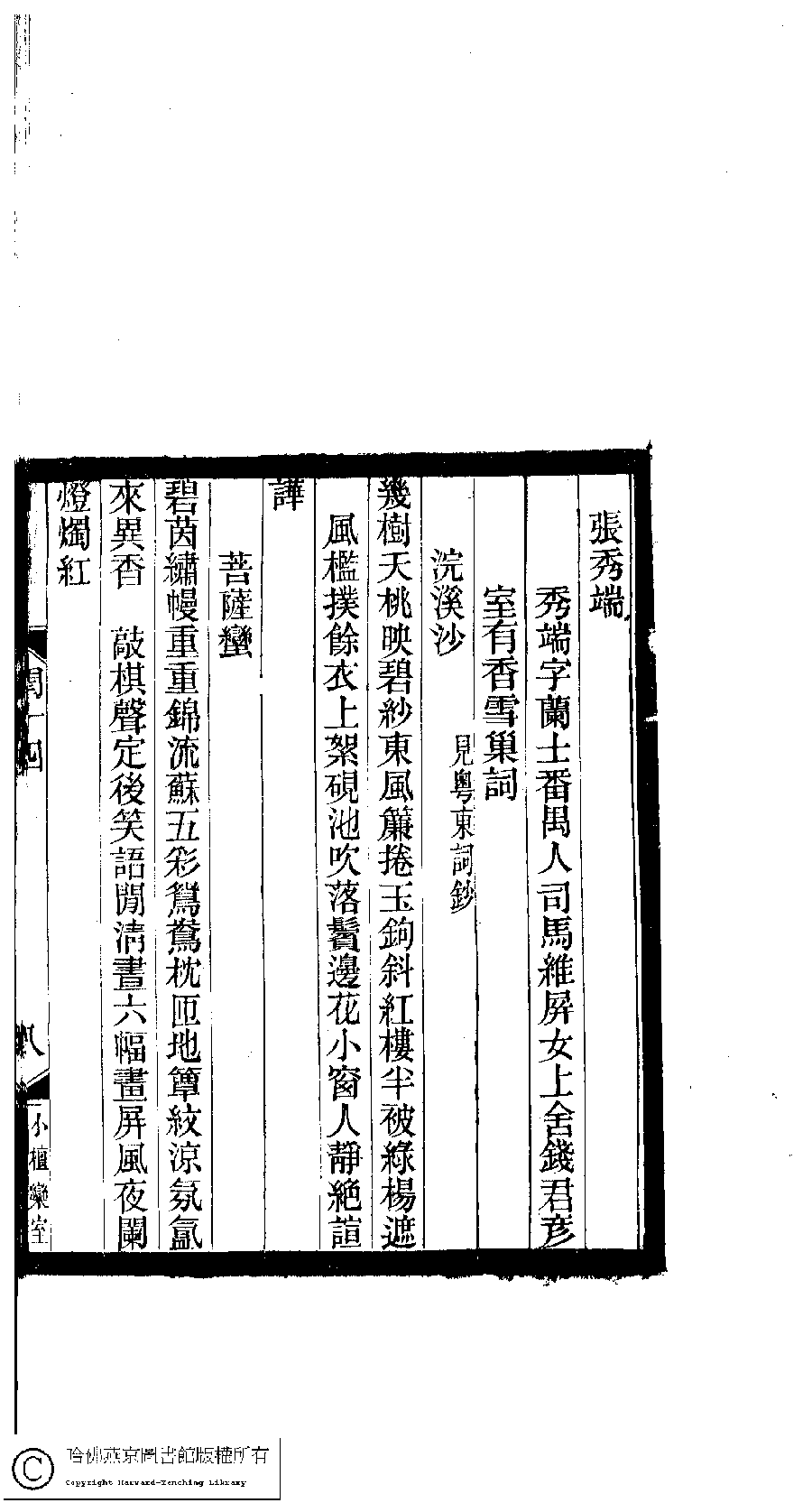 | (PRINT FRIENDLY VERSION) 閨秀詞鈔﹕十六卷(清徐乃昌輯)。清宣統元年(1909)小檀欒室刻本。 ![]() Page : 14.8a | click for larger image | Back |