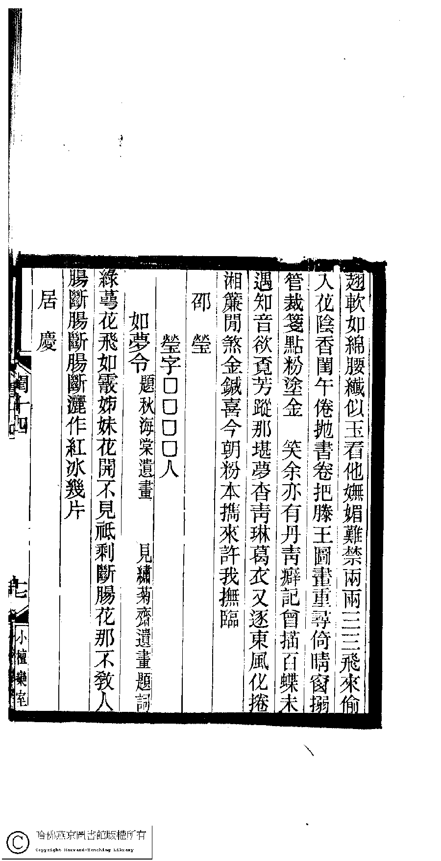 | (PRINT FRIENDLY VERSION) 閨秀詞鈔﹕十六卷(清徐乃昌輯)。清宣統元年(1909)小檀欒室刻本。 ![]() Page : 14.17a | click for larger image | 閨秀詞鈔﹕十六卷(清徐乃昌輯)。清宣統元年(1909)小檀欒室刻本。![]() Page : 14.16b | click for larger image | Back |