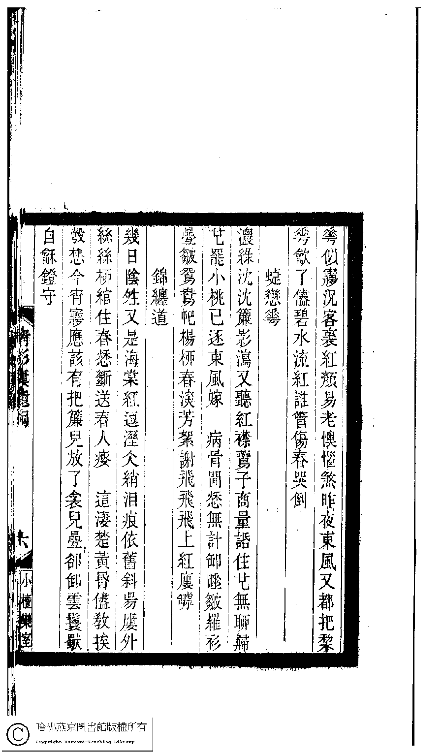 | (PRINT FRIENDLY VERSION) 小檀欒室彙刻閨秀詞﹕十集一百種一百卷(清徐乃昌輯) : 倩影樓遺詞﹕一卷。清光緒二十二年(1896)南陵徐氏刻本。 ![]() Page : 倩影樓遺詞.6a | click for larger image | Back |