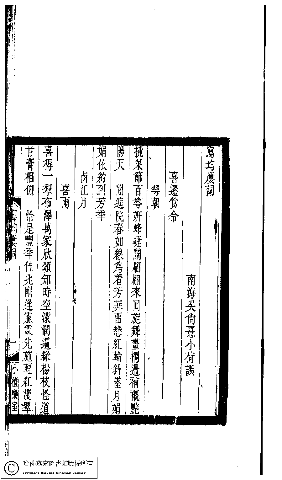 | Appears in: Xiao tan luan shi hui ke gui xiu ci: 10 ji 100 zhong 100 juan (edited by Xu Naichang, Qing dynasty): Xie yun lou ci: 1 juan |