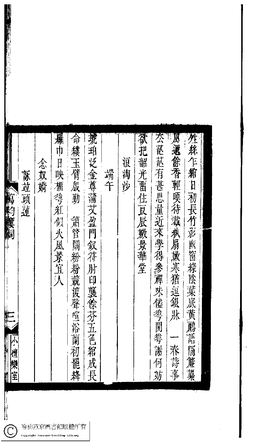 | (PRINT FRIENDLY VERSION) 小檀欒室彙刻閨秀詞﹕十集一百種一百卷(清徐乃昌輯) : 寫均樓詞﹕一卷。清光緒二十二年(1896)南陵徐氏刻本。 ![]() Page : 寫均樓詞.3a | click for larger image | 小檀欒室彙刻閨秀詞﹕十集一百種一百卷(清徐乃昌輯) : 寫均樓詞﹕一卷。清光緒二十二年(1896)南陵徐氏刻本。![]() Page : 寫均樓詞.2b | click for larger image | Back |