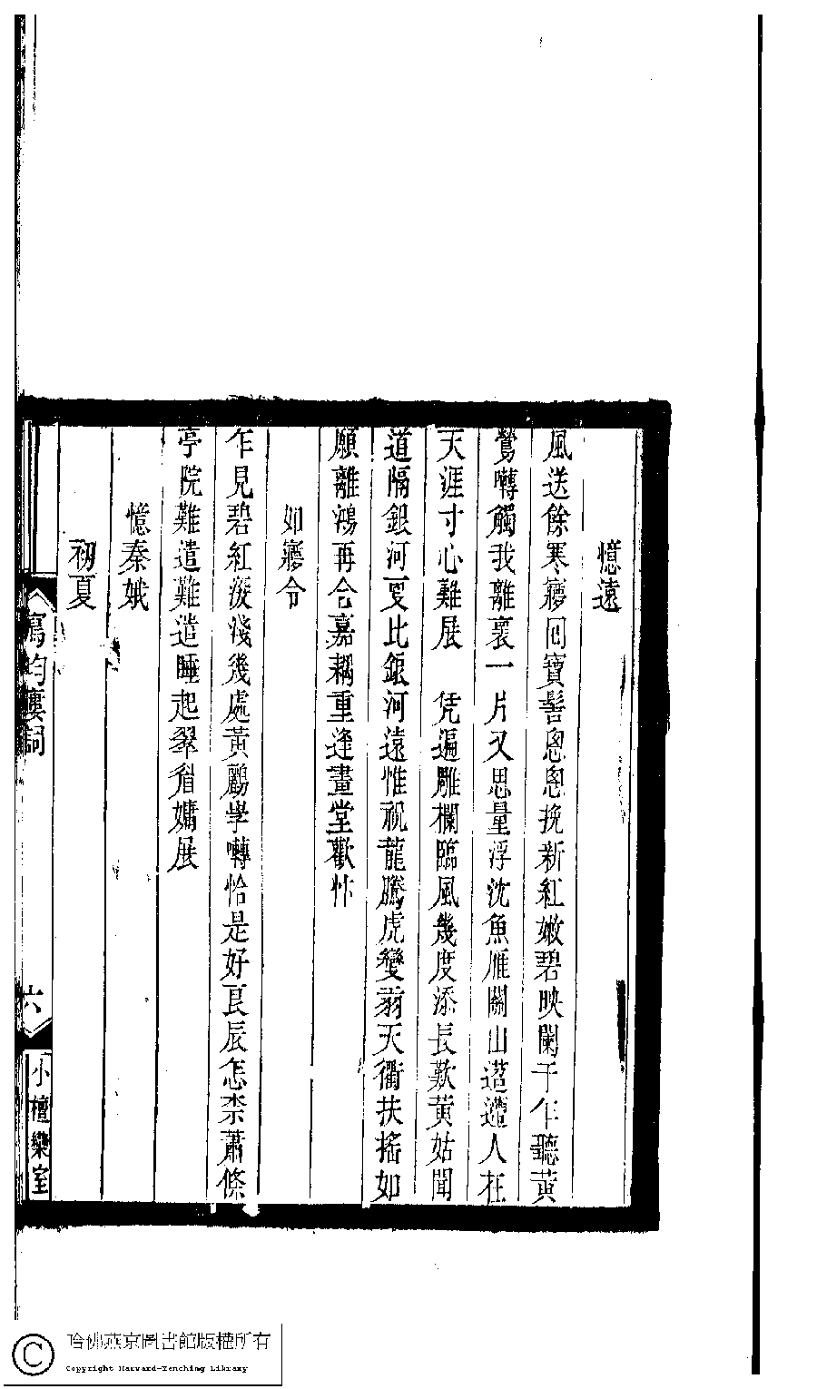 | (PRINT FRIENDLY VERSION) 小檀欒室彙刻閨秀詞﹕十集一百種一百卷(清徐乃昌輯) : 寫均樓詞﹕一卷。清光緒二十二年(1896)南陵徐氏刻本。 ![]() Page : 寫均樓詞.6b | click for larger image | 小檀欒室彙刻閨秀詞﹕十集一百種一百卷(清徐乃昌輯) : 寫均樓詞﹕一卷。清光緒二十二年(1896)南陵徐氏刻本。![]() Page : 寫均樓詞.6a | click for larger image | Back |