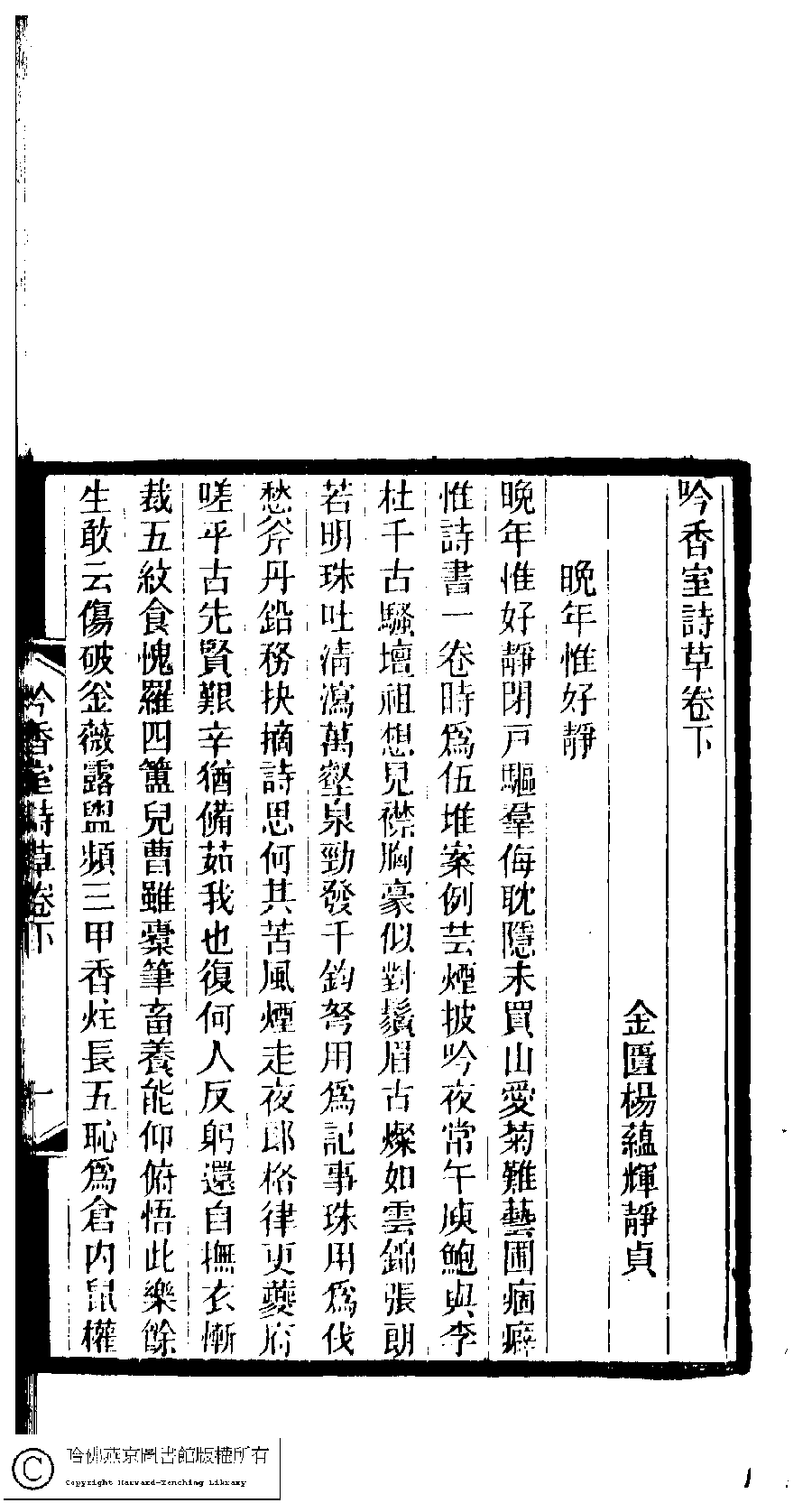 | (PRINT FRIENDLY VERSION) 吟香室詩草﹕二卷﹐續刻﹕一卷﹐附刻﹕一卷(清楊蘊輝撰)。清光緒二十三年(1897)刻本。 ![]() Page : 2.1b | click for larger image | 吟香室詩草﹕二卷﹐續刻﹕一卷﹐附刻﹕一卷(清楊蘊輝撰)。清光緒二十三年(1897)刻本。![]() Page : 2.1a | click for larger image | Back |
