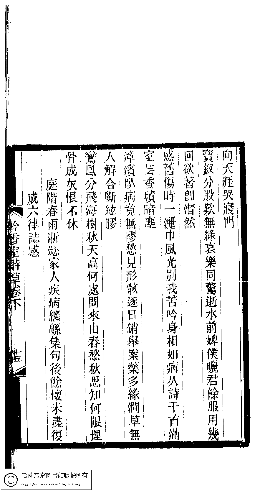 | (PRINT FRIENDLY VERSION) 吟香室詩草﹕二卷﹐續刻﹕一卷﹐附刻﹕一卷(清楊蘊輝撰)。清光緒二十三年(1897)刻本。 ![]() Page : 2.16a | click for larger image | 吟香室詩草﹕二卷﹐續刻﹕一卷﹐附刻﹕一卷(清楊蘊輝撰)。清光緒二十三年(1897)刻本。![]() Page : 2.15b | click for larger image | 吟香室詩草﹕二卷﹐續刻﹕一卷﹐附刻﹕一卷(清楊蘊輝撰)。清光緒二十三年(1897)刻本。![]() Page : 2.15a | click for larger image | Back |
