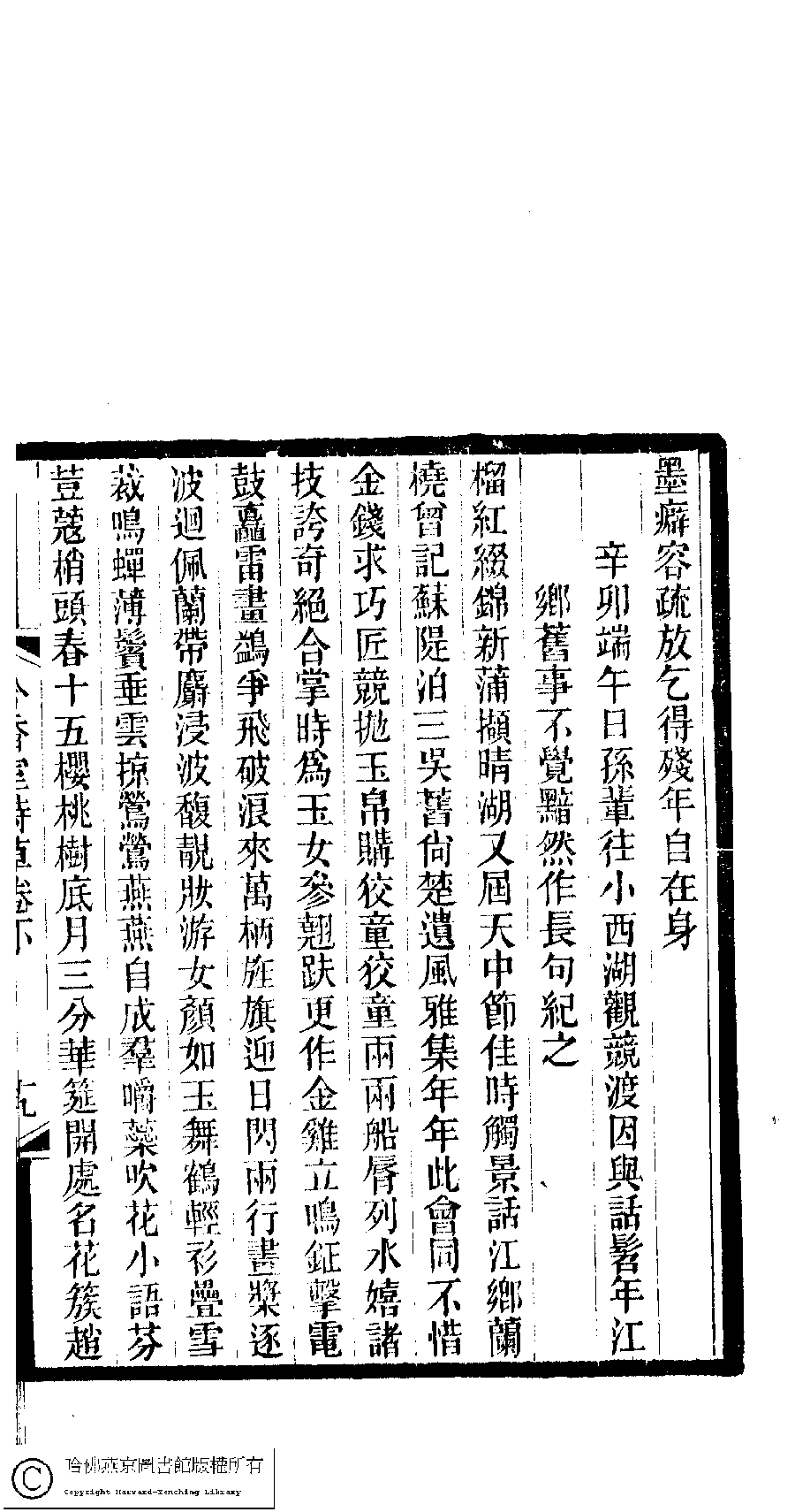 Poem [Xin mao Duan wu ri sun bei wang xiao Xi Hu guan jing du yin yu hua tiao nian jiang xiang jiu shi bu jue an ran zuo chang ju ji zhi ]