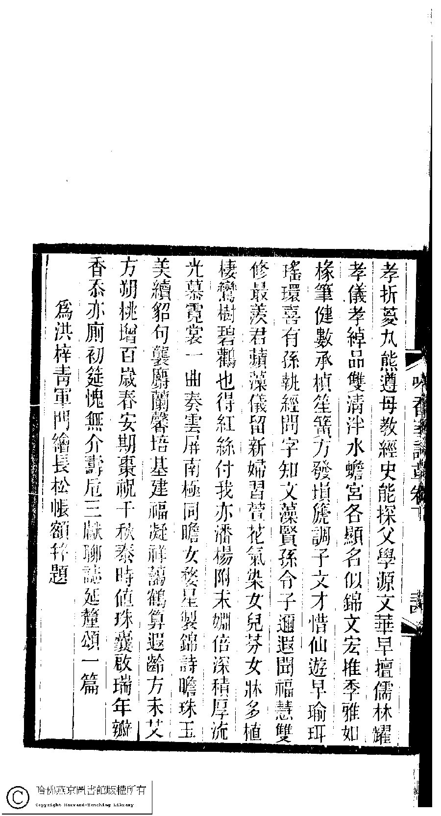 | (PRINT FRIENDLY VERSION) 吟香室詩草﹕二卷﹐續刻﹕一卷﹐附刻﹕一卷(清楊蘊輝撰)。清光緒二十三年(1897)刻本。 ![]() Page : 2.24b | click for larger image | 吟香室詩草﹕二卷﹐續刻﹕一卷﹐附刻﹕一卷(清楊蘊輝撰)。清光緒二十三年(1897)刻本。![]() Page : 2.24a | click for larger image | 吟香室詩草﹕二卷﹐續刻﹕一卷﹐附刻﹕一卷(清楊蘊輝撰)。清光緒二十三年(1897)刻本。![]() Page : 2.23b | click for larger image | Back |