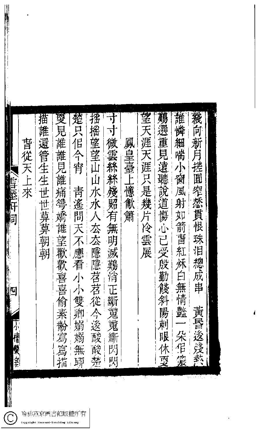| (PRINT FRIENDLY VERSION) 小檀欒室彙刻閨秀詞﹕十集一百種一百卷(清徐乃昌輯) : 雪壓軒詞﹕一卷。清光緒二十二年(1896)南陵徐氏刻本。 ![]() Page : 1.4b | click for larger image | 小檀欒室彙刻閨秀詞﹕十集一百種一百卷(清徐乃昌輯) : 雪壓軒詞﹕一卷。清光緒二十二年(1896)南陵徐氏刻本。![]() Page : 1.4a | click for larger image | Back |