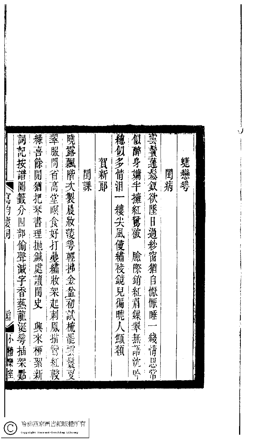 | Appears in: Xiao tan luan shi hui ke gui xiu ci: 10 ji 100 zhong 100 juan (edited by Xu Naichang, Qing dynasty): Xie yun lou ci: 1 juan |