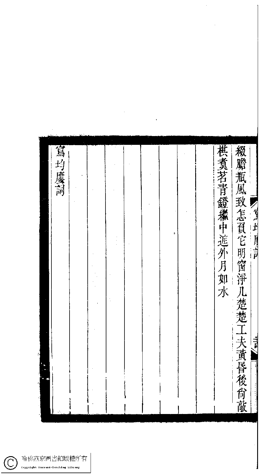 | (PRINT FRIENDLY VERSION) 小檀欒室彙刻閨秀詞﹕十集一百種一百卷(清徐乃昌輯) : 寫均樓詞﹕一卷。清光緒二十二年(1896)南陵徐氏刻本。 ![]() Page : 寫均樓詞.24b | click for larger image | 小檀欒室彙刻閨秀詞﹕十集一百種一百卷(清徐乃昌輯) : 寫均樓詞﹕一卷。清光緒二十二年(1896)南陵徐氏刻本。![]() Page : 寫均樓詞.24a | click for larger image | Back |