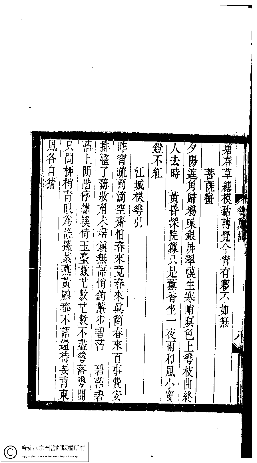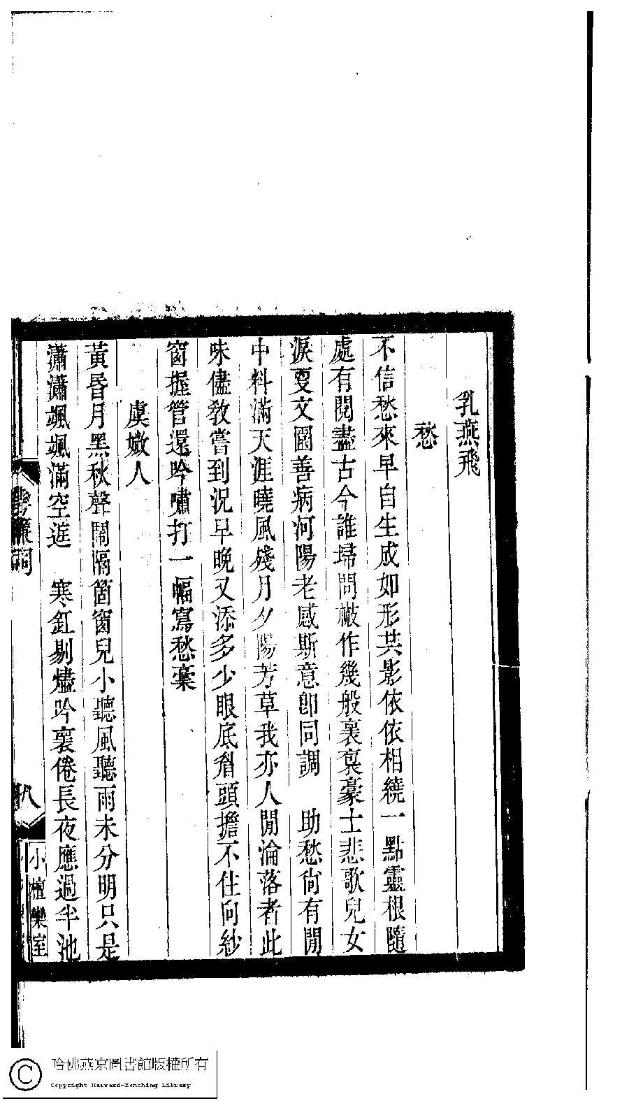 | (PRINT FRIENDLY VERSION) 小檀欒室彙刻閨秀詞﹕十集一百種一百卷(清徐乃昌輯) : 花簾詞﹕一卷。清光緒二十二年(1896)南陵徐氏刻本。 ![]() Page : 花簾詞.8b | click for larger image | 小檀欒室彙刻閨秀詞﹕十集一百種一百卷(清徐乃昌輯) : 花簾詞﹕一卷。清光緒二十二年(1896)南陵徐氏刻本。![]() Page : 花簾詞.8a | click for larger image | Back |