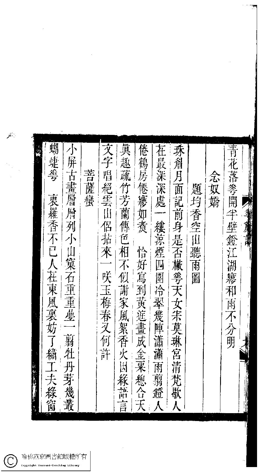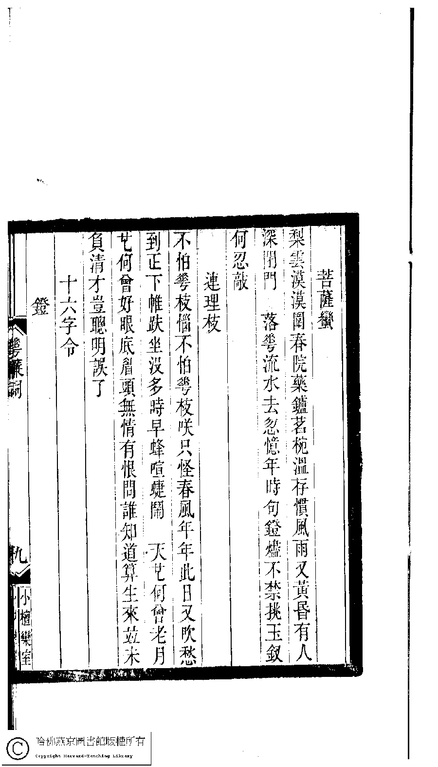 | (PRINT FRIENDLY VERSION) 小檀欒室彙刻閨秀詞﹕十集一百種一百卷(清徐乃昌輯) : 花簾詞﹕一卷。清光緒二十二年(1896)南陵徐氏刻本。 ![]() Page : 花簾詞.9b | click for larger image | 小檀欒室彙刻閨秀詞﹕十集一百種一百卷(清徐乃昌輯) : 花簾詞﹕一卷。清光緒二十二年(1896)南陵徐氏刻本。![]() Page : 花簾詞.9a | click for larger image | Back |