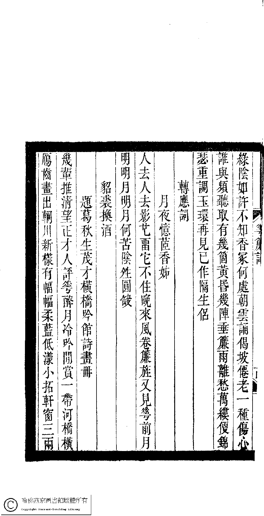 | (PRINT FRIENDLY VERSION) 小檀欒室彙刻閨秀詞﹕十集一百種一百卷(清徐乃昌輯) : 花簾詞﹕一卷。清光緒二十二年(1896)南陵徐氏刻本。 ![]() Page : 花簾詞.15a | click for larger image | 小檀欒室彙刻閨秀詞﹕十集一百種一百卷(清徐乃昌輯) : 花簾詞﹕一卷。清光緒二十二年(1896)南陵徐氏刻本。![]() Page : 花簾詞.14b | click for larger image | Back |