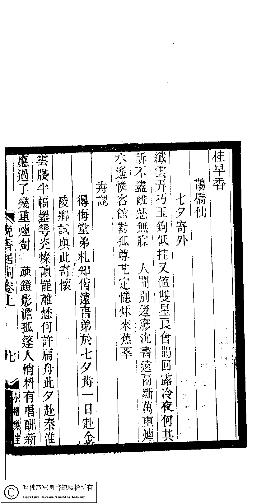 | (PRINT FRIENDLY VERSION) 小檀欒室彙刻閨秀詞﹕十集一百種一百卷(清徐乃昌輯) : 晚香居詞﹕二卷。清光緒二十二年(1896)南陵徐氏刻本。 ![]() Page : 卷上.7a | click for larger image | Back |
