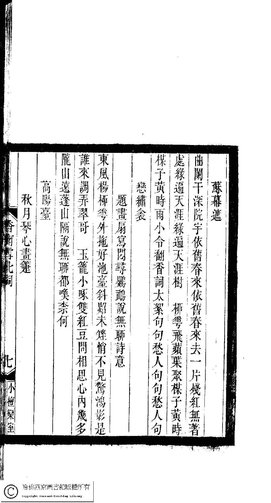 | Appears in: Xiao tan luan shi hui ke gui xiu ci: 10 ji 100 zhong 100 juan (edited by Xu Naichang, Qing dynasty): Xiang nan xue bei ci: 1 juan |
