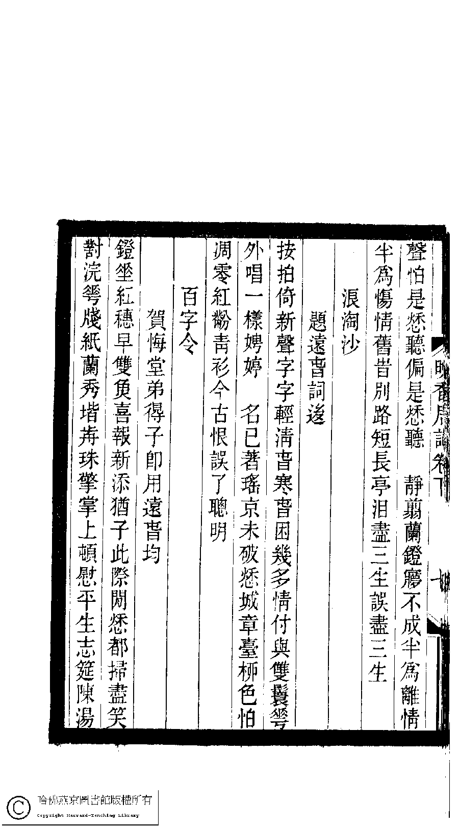| (PRINT FRIENDLY VERSION) 小檀欒室彙刻閨秀詞﹕十集一百種一百卷(清徐乃昌輯) : 晚香居詞﹕二卷。清光緒二十二年(1896)南陵徐氏刻本。 ![]() Page : 卷下.7b | click for larger image | 小檀欒室彙刻閨秀詞﹕十集一百種一百卷(清徐乃昌輯) : 晚香居詞﹕二卷。清光緒二十二年(1896)南陵徐氏刻本。![]() Page : 卷下.7a | click for larger image | Back |