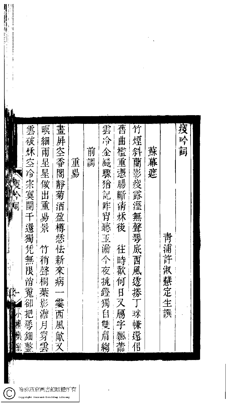 | (PRINT FRIENDLY VERSION) 小檀欒室彙刻閨秀詞﹕十集一百種一百卷(清徐乃昌輯) : 瘦吟詞﹕一卷。清光緒二十二年(1896)南陵徐氏刻本。 ![]() Page : 瘦吟詞.1a | click for larger image | Back |