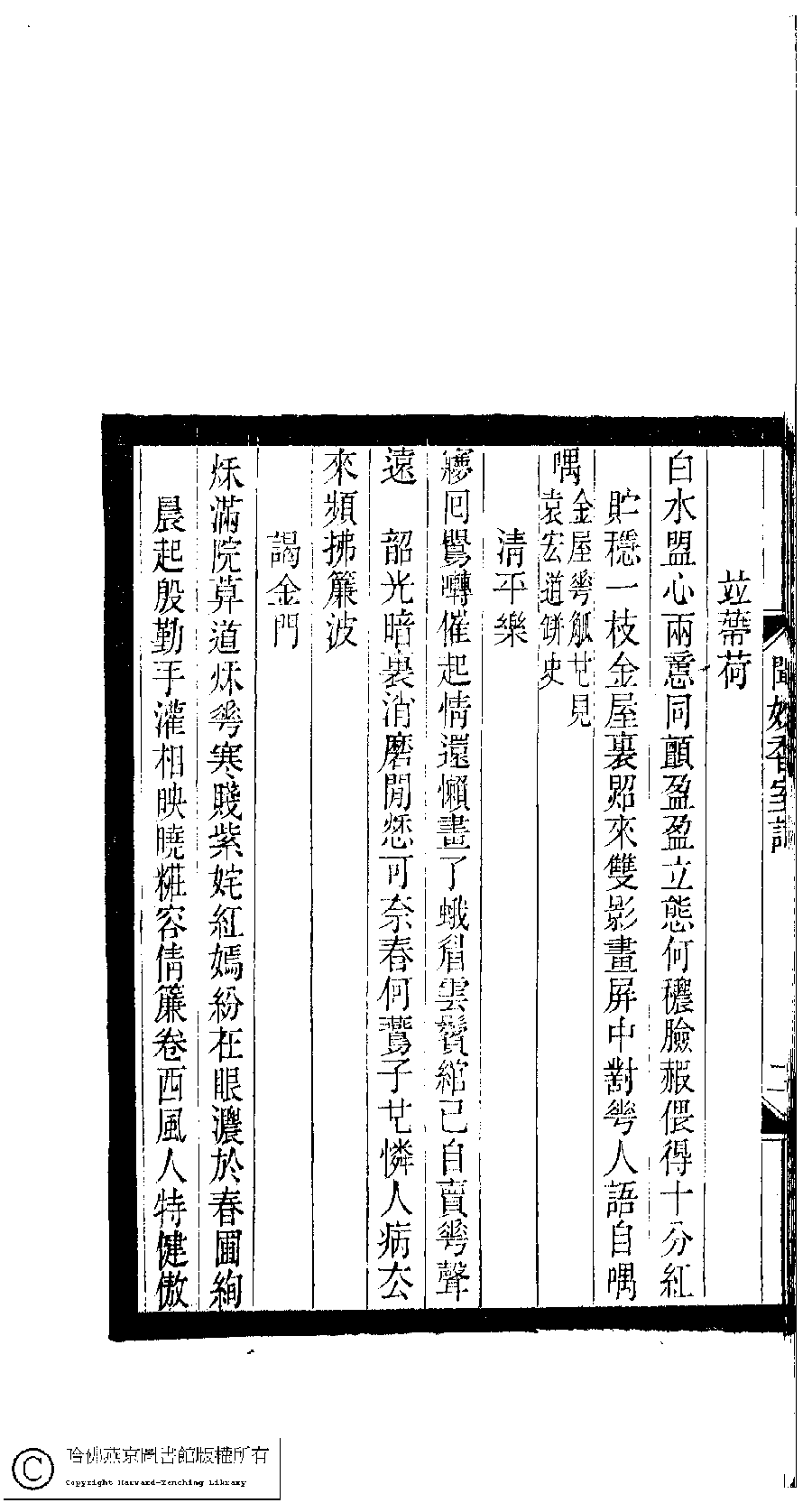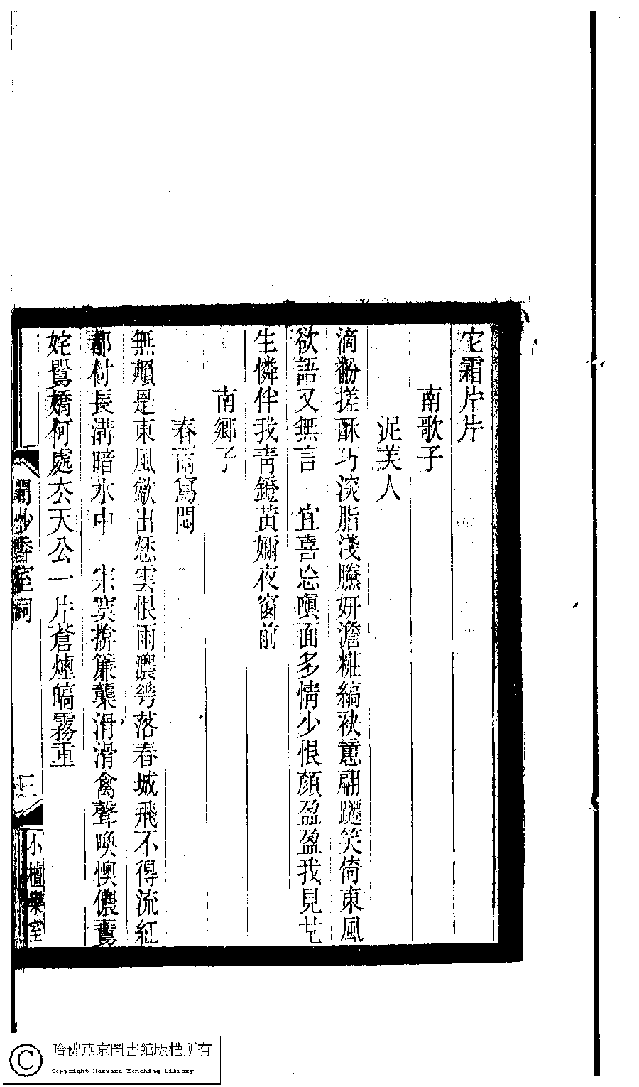 | (PRINT FRIENDLY VERSION) 小檀欒室彙刻閨秀詞﹕十集一百種一百卷(清徐乃昌輯) : 聞妙香室詞﹕一卷。清光緒二十二年(1896)南陵徐氏刻本。 ![]() Page : 聞妙香室詞.3a | click for larger image | 小檀欒室彙刻閨秀詞﹕十集一百種一百卷(清徐乃昌輯) : 聞妙香室詞﹕一卷。清光緒二十二年(1896)南陵徐氏刻本。![]() Page : 聞妙香室詞.2b | click for larger image | Back |
