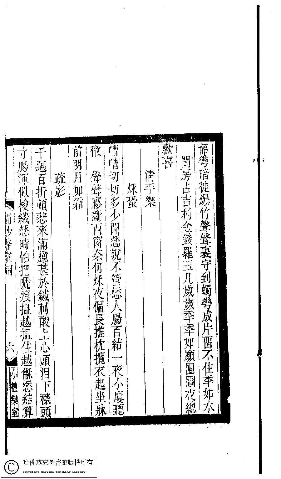 | (PRINT FRIENDLY VERSION) 小檀欒室彙刻閨秀詞﹕十集一百種一百卷(清徐乃昌輯) : 聞妙香室詞﹕一卷。清光緒二十二年(1896)南陵徐氏刻本。 ![]() Page : 聞妙香室詞.6b | click for larger image | 小檀欒室彙刻閨秀詞﹕十集一百種一百卷(清徐乃昌輯) : 聞妙香室詞﹕一卷。清光緒二十二年(1896)南陵徐氏刻本。![]() Page : 聞妙香室詞.6a | click for larger image | Back |