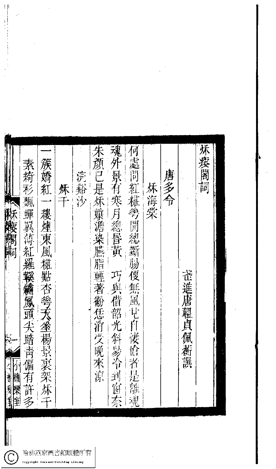 | (PRINT FRIENDLY VERSION) 小檀欒室彙刻閨秀詞﹕十集一百種一百卷(清徐乃昌輯) : 秋瘦閣詞﹕一卷。清光緒二十二年(1896)南陵徐氏刻本。 ![]() Page : 秋瘦閣詞.1a | click for larger image | Back |