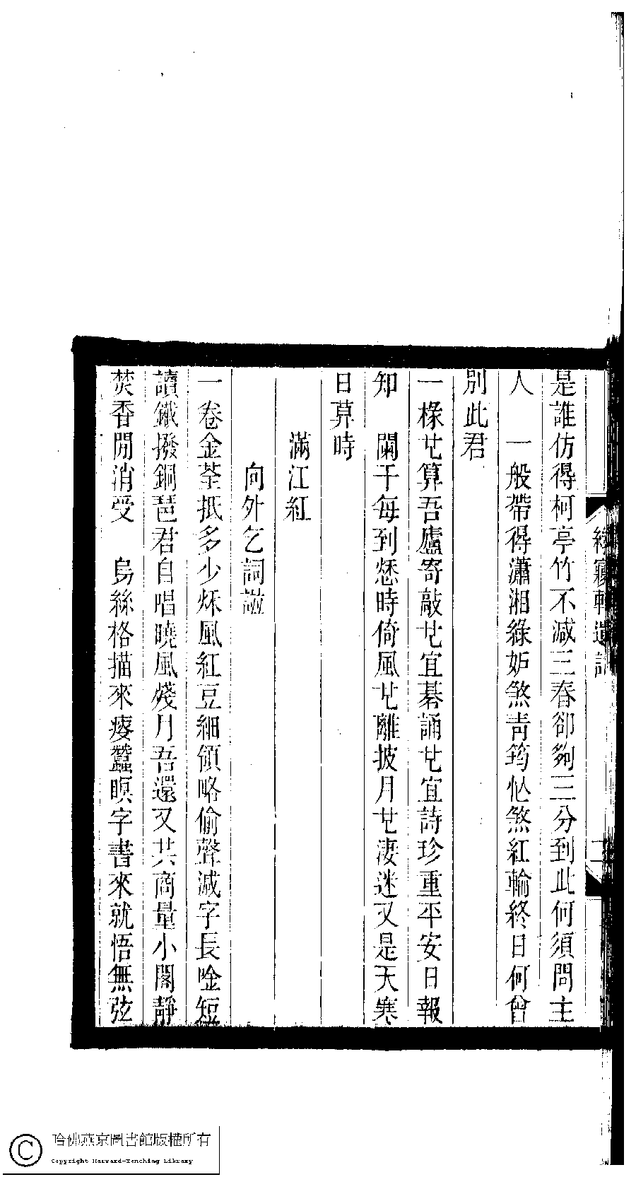 | (PRINT FRIENDLY VERSION) 小檀欒室彙刻閨秀詞﹕十集一百種一百卷(清徐乃昌輯) : 綠夢軒遺詞﹕一卷。清光緒二十二年(1896)南陵徐氏刻本。 ![]() Page : 綠夢軒遺詞.2b | click for larger image | 小檀欒室彙刻閨秀詞﹕十集一百種一百卷(清徐乃昌輯) : 綠夢軒遺詞﹕一卷。清光緒二十二年(1896)南陵徐氏刻本。![]() Page : 綠夢軒遺詞.2a | click for larger image | Back |
