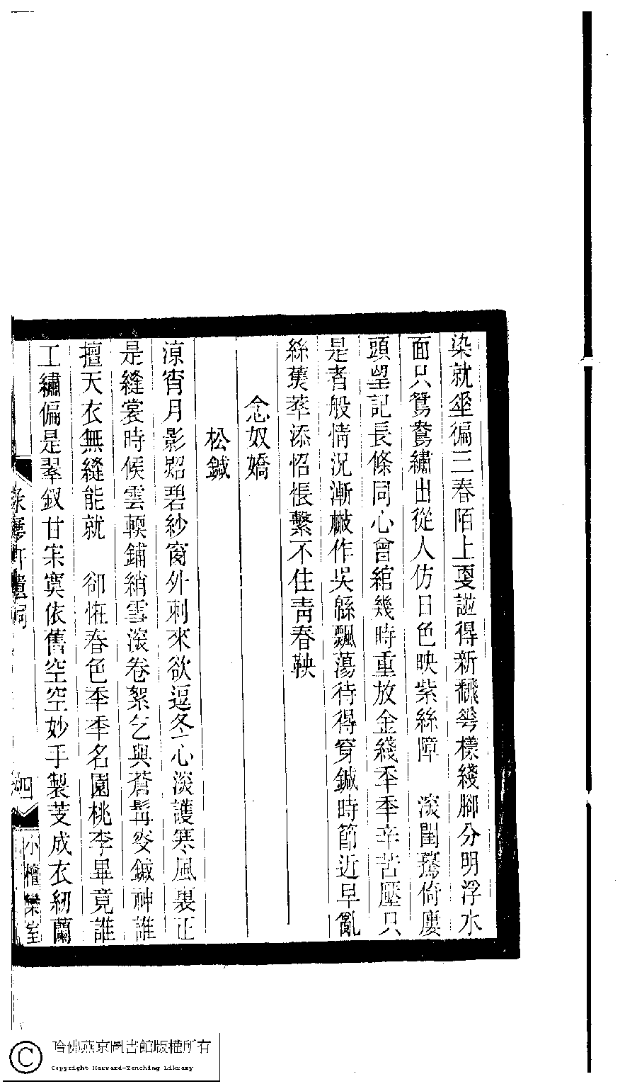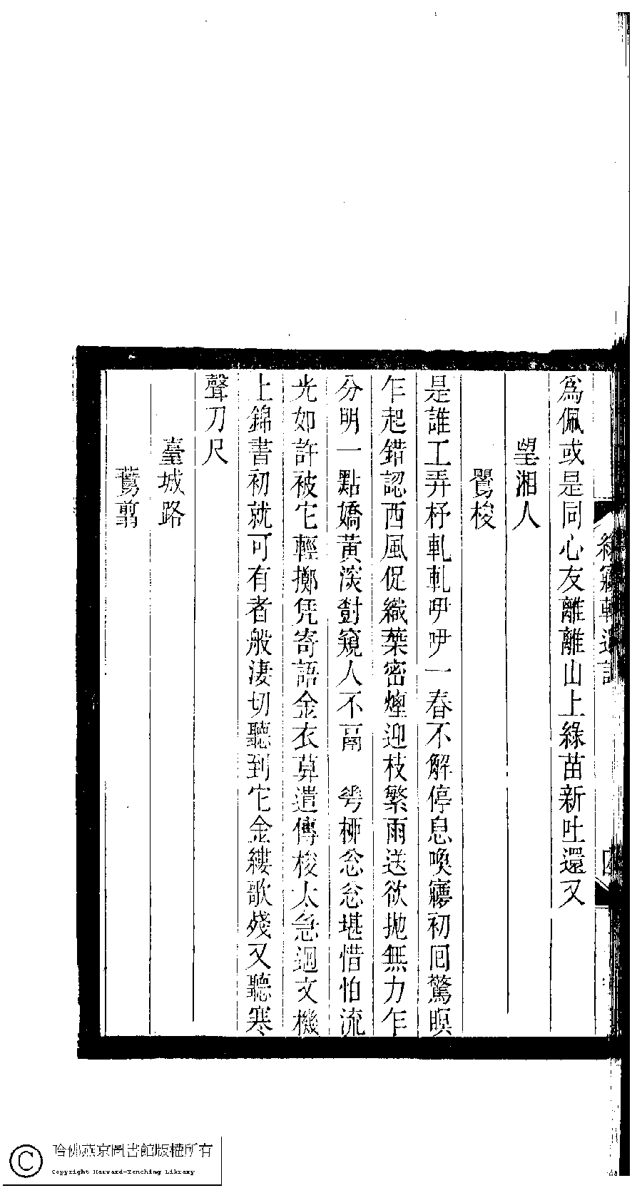 | (PRINT FRIENDLY VERSION) 小檀欒室彙刻閨秀詞﹕十集一百種一百卷(清徐乃昌輯) : 綠夢軒遺詞﹕一卷。清光緒二十二年(1896)南陵徐氏刻本。 ![]() Page : 綠夢軒遺詞.4b | click for larger image | 小檀欒室彙刻閨秀詞﹕十集一百種一百卷(清徐乃昌輯) : 綠夢軒遺詞﹕一卷。清光緒二十二年(1896)南陵徐氏刻本。![]() Page : 綠夢軒遺詞.4a | click for larger image | Back |