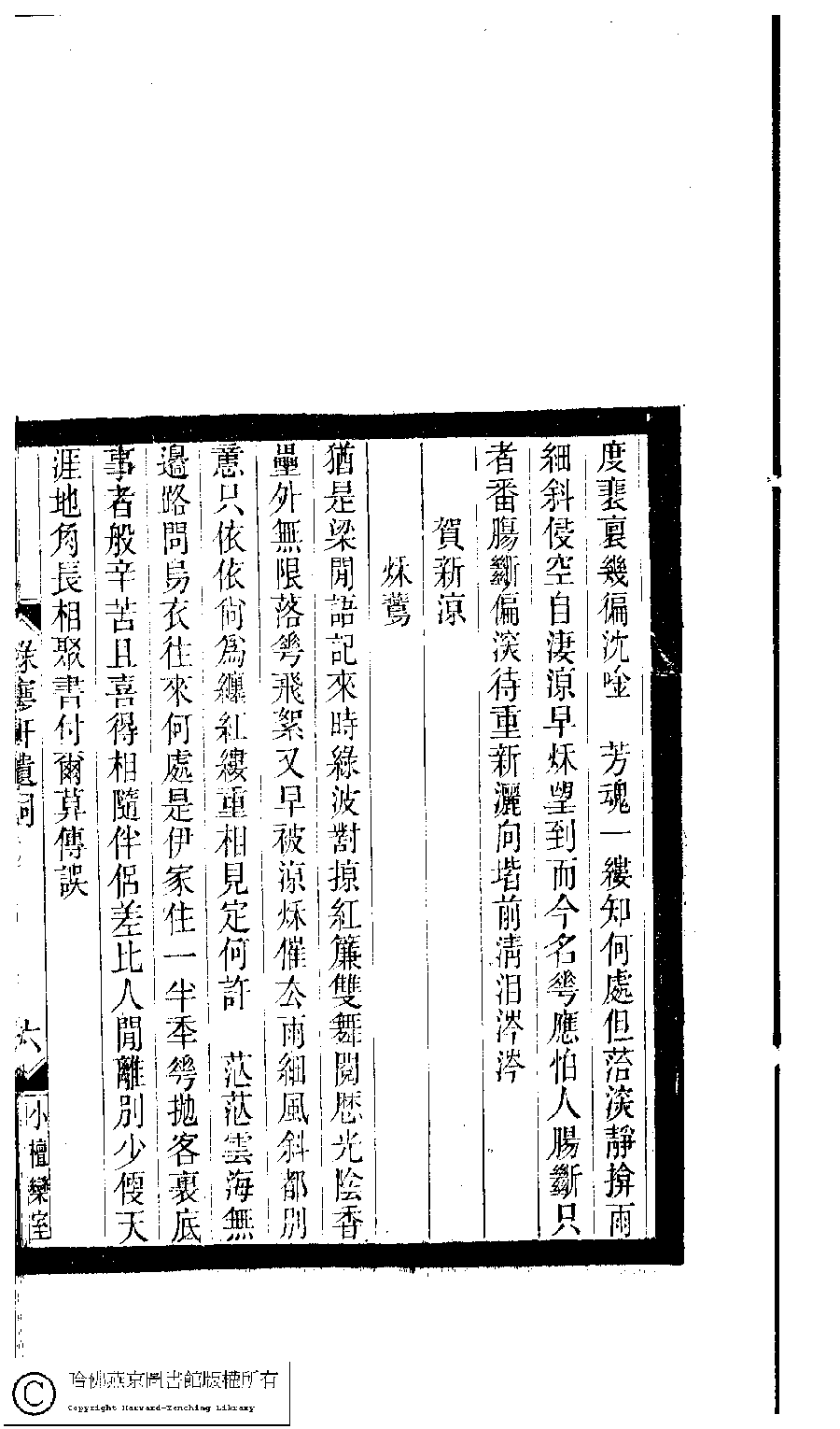 | (PRINT FRIENDLY VERSION) 小檀欒室彙刻閨秀詞﹕十集一百種一百卷(清徐乃昌輯) : 綠夢軒遺詞﹕一卷。清光緒二十二年(1896)南陵徐氏刻本。 ![]() Page : 綠夢軒遺詞.6a | click for larger image | 小檀欒室彙刻閨秀詞﹕十集一百種一百卷(清徐乃昌輯) : 綠夢軒遺詞﹕一卷。清光緒二十二年(1896)南陵徐氏刻本。![]() Page : 綠夢軒遺詞.5b | click for larger image | Back |
