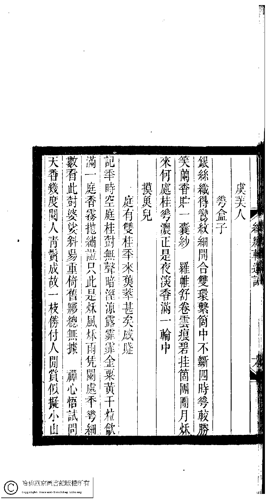 | (PRINT FRIENDLY VERSION) 小檀欒室彙刻閨秀詞﹕十集一百種一百卷(清徐乃昌輯) : 綠夢軒遺詞﹕一卷。清光緒二十二年(1896)南陵徐氏刻本。 ![]() Page : 綠夢軒遺詞.7a | click for larger image | 小檀欒室彙刻閨秀詞﹕十集一百種一百卷(清徐乃昌輯) : 綠夢軒遺詞﹕一卷。清光緒二十二年(1896)南陵徐氏刻本。![]() Page : 綠夢軒遺詞.6b | click for larger image | Back |