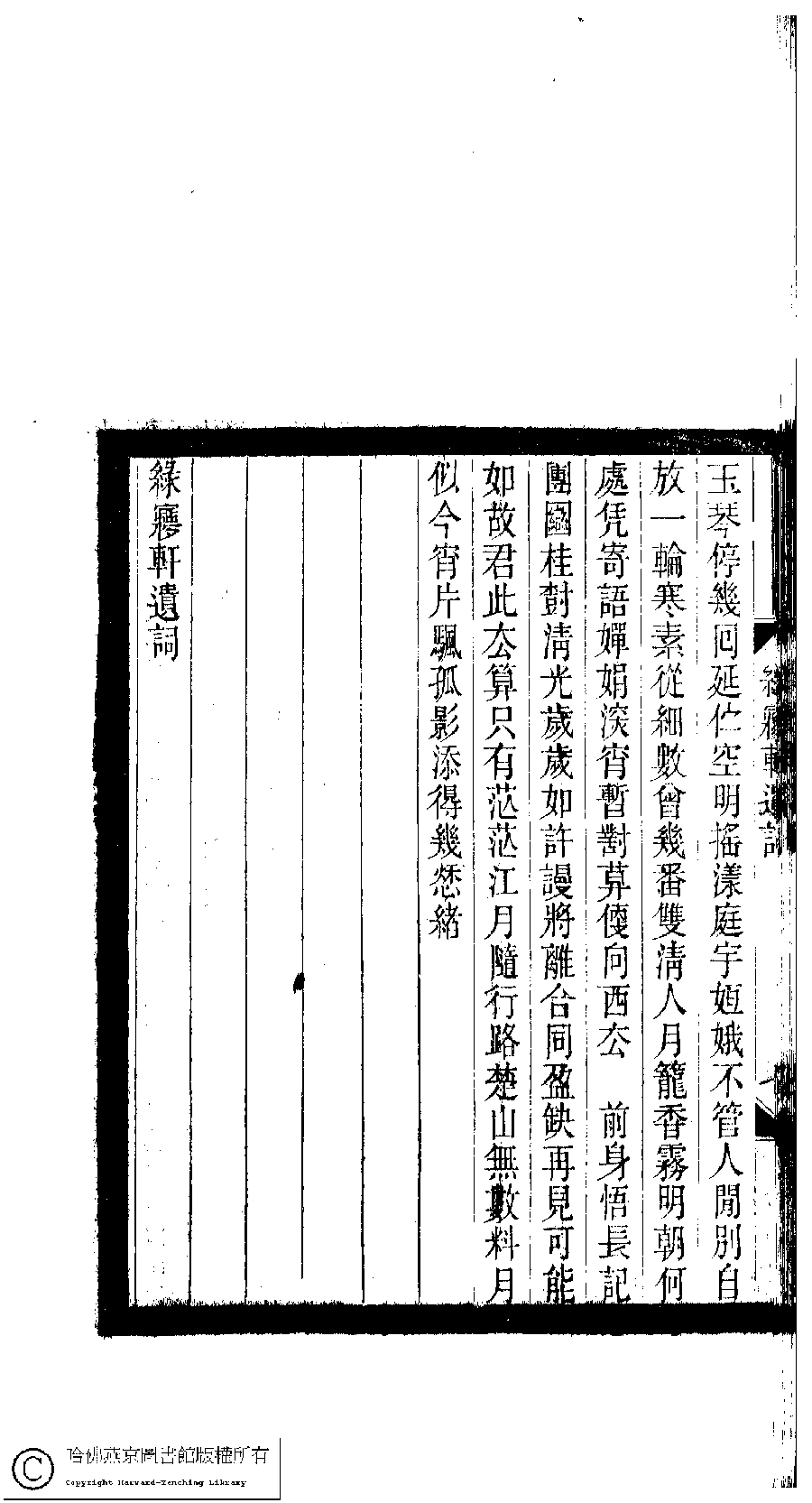 | (PRINT FRIENDLY VERSION) 小檀欒室彙刻閨秀詞﹕十集一百種一百卷(清徐乃昌輯) : 綠夢軒遺詞﹕一卷。清光緒二十二年(1896)南陵徐氏刻本。 ![]() Page : 綠夢軒遺詞.7b | click for larger image | 小檀欒室彙刻閨秀詞﹕十集一百種一百卷(清徐乃昌輯) : 綠夢軒遺詞﹕一卷。清光緒二十二年(1896)南陵徐氏刻本。![]() Page : 綠夢軒遺詞.7a | click for larger image | Back |