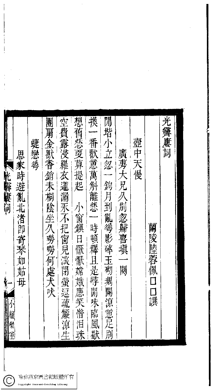 | Appears in: Xiao tan luan shi hui ke gui xiu ci: 10 ji 100 zhong 100 juan (edited by Xu Naichang, Qing dynasty): Guang ji lou ci: 1 juan |