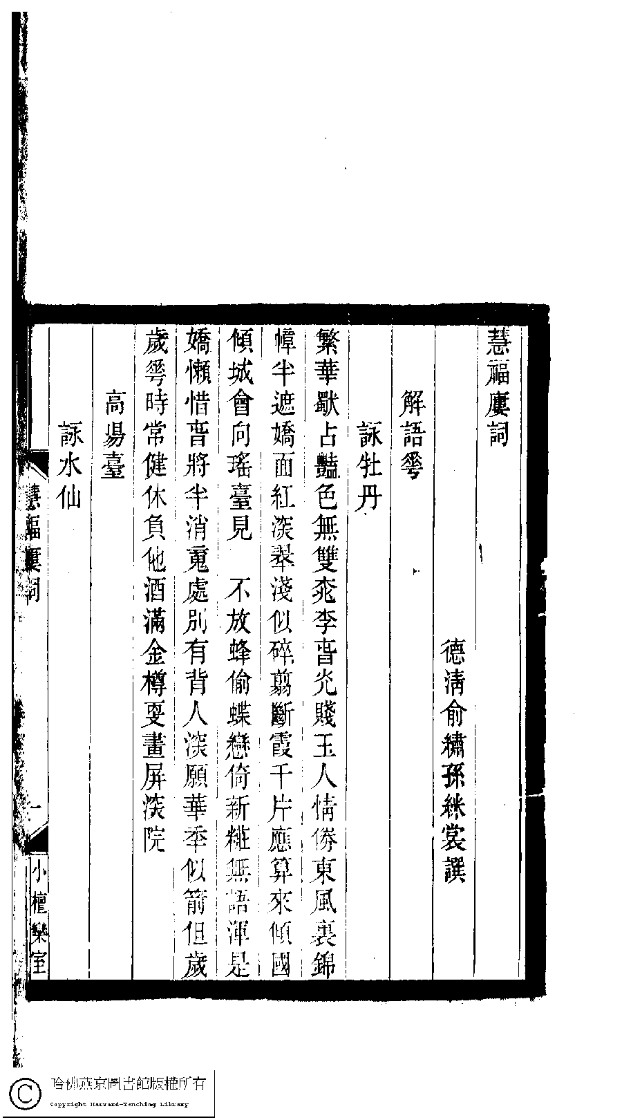 | (PRINT FRIENDLY VERSION) 小檀欒室彙刻閨秀詞﹕十集一百種一百卷(清徐乃昌輯) : 慧福樓詞﹕一卷。清光緒二十二年(1896)南陵徐氏刻本。 ![]() Page : 慧福樓詞.1b | click for larger image | 小檀欒室彙刻閨秀詞﹕十集一百種一百卷(清徐乃昌輯) : 慧福樓詞﹕一卷。清光緒二十二年(1896)南陵徐氏刻本。![]() Page : 慧福樓詞.1a | click for larger image | Back |