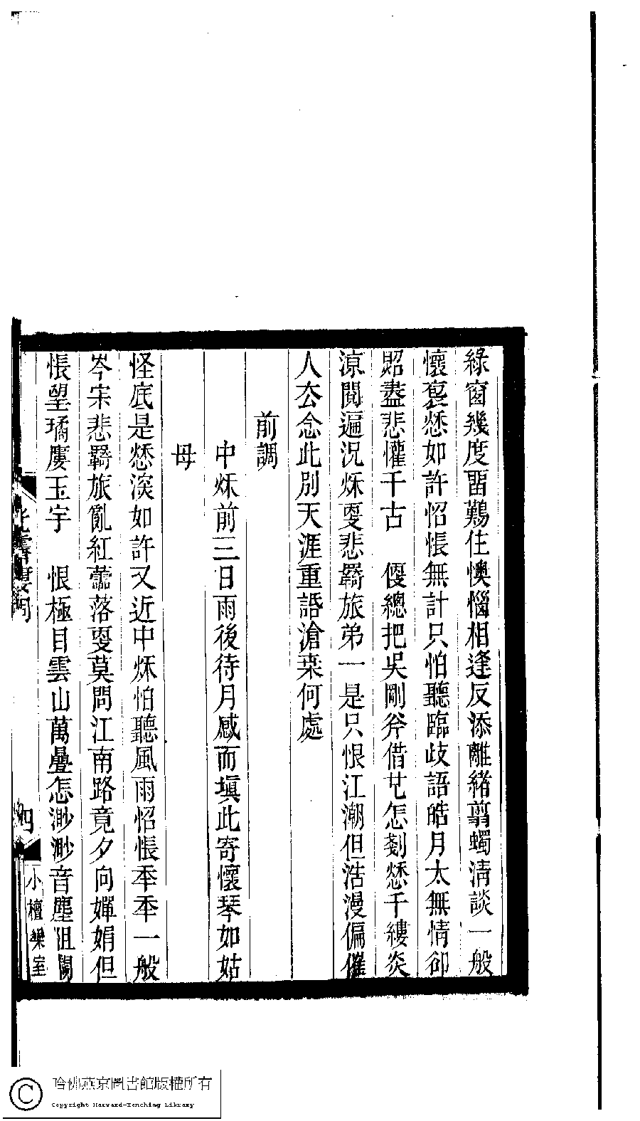 | (PRINT FRIENDLY VERSION) 小檀欒室彙刻閨秀詞﹕十集一百種一百卷(清徐乃昌輯) : 光霽樓詞﹕一卷。清光緒二十二年(1896)南陵徐氏刻本。 ![]() Page : 光霽樓詞.4a | click for larger image | 小檀欒室彙刻閨秀詞﹕十集一百種一百卷(清徐乃昌輯) : 光霽樓詞﹕一卷。清光緒二十二年(1896)南陵徐氏刻本。![]() Page : 光霽樓詞.3b | click for larger image | Back |