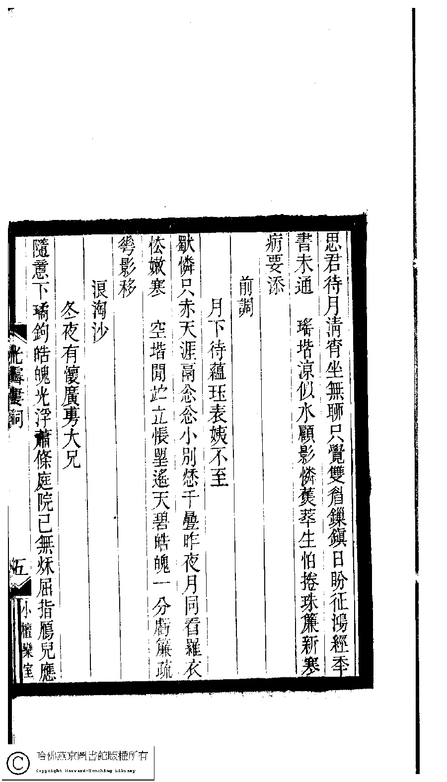 | (PRINT FRIENDLY VERSION) 小檀欒室彙刻閨秀詞﹕十集一百種一百卷(清徐乃昌輯) : 光霽樓詞﹕一卷。清光緒二十二年(1896)南陵徐氏刻本。 ![]() Page : 光霽樓詞.5b | click for larger image | 小檀欒室彙刻閨秀詞﹕十集一百種一百卷(清徐乃昌輯) : 光霽樓詞﹕一卷。清光緒二十二年(1896)南陵徐氏刻本。![]() Page : 光霽樓詞.5a | click for larger image | Back |