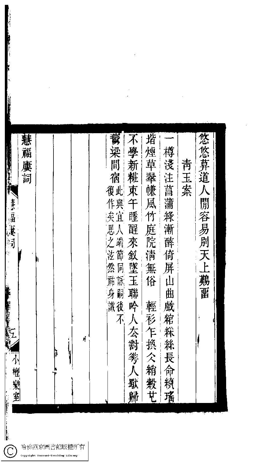 | (PRINT FRIENDLY VERSION) 小檀欒室彙刻閨秀詞﹕十集一百種一百卷(清徐乃昌輯) : 慧福樓詞﹕一卷。清光緒二十二年(1896)南陵徐氏刻本。 ![]() Page : 慧福樓詞.5a | click for larger image | 小檀欒室彙刻閨秀詞﹕十集一百種一百卷(清徐乃昌輯) : 慧福樓詞﹕一卷。清光緒二十二年(1896)南陵徐氏刻本。![]() Page : 慧福樓詞.4b | click for larger image | Back |