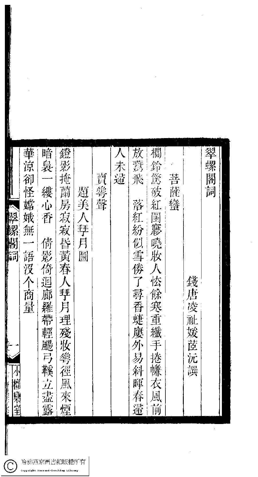 | Appears in: Xiao tan luan shi hui ke gui xiu ci: 10 ji 100 zhong 100 juan (edited by Xu Naichang, Qing dynasty): Cui luo ge ci: 1 juan |